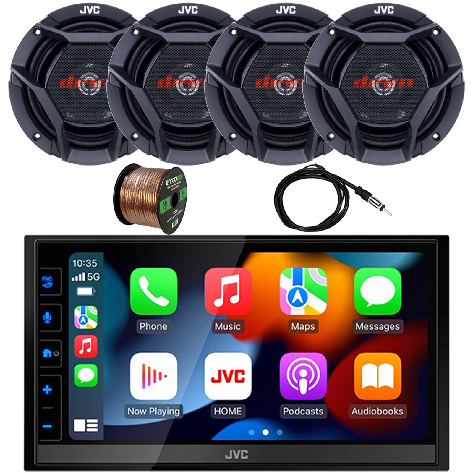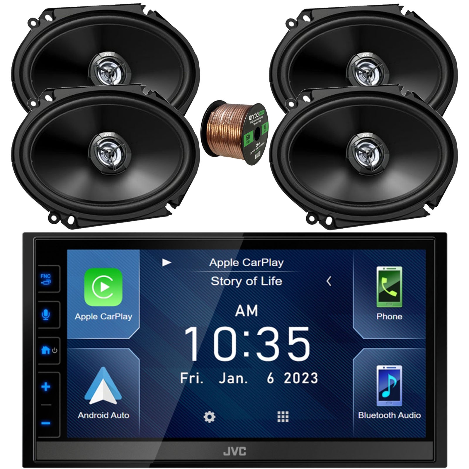 In-Dash Double DIN 6.8" Touchscreen HDMI Bluetooth USB Digital Multimedia Car Radio Receiver, 4x 6x8" 300 Watt Max 2-Way Vehicle Audio Speakers, 22" Antenna, 16 Gauge 50 ft Speaker Wire