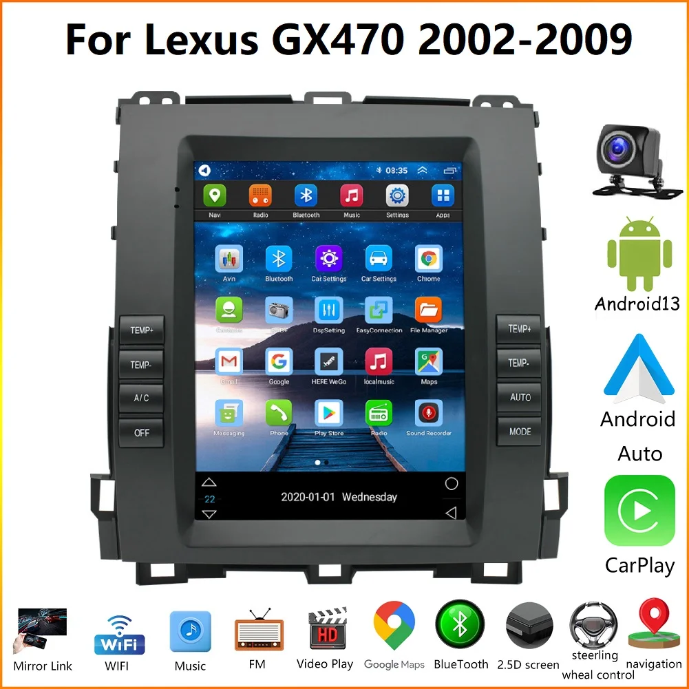 ispchen Car Stereo Radio for Lexus GX470 2002-2009 Android 13 Car Navigation 9.7" Support Carplay And Android Auto, 2 + 32GB Wifi Bluetooth Radio With AHD Camera+Microphone