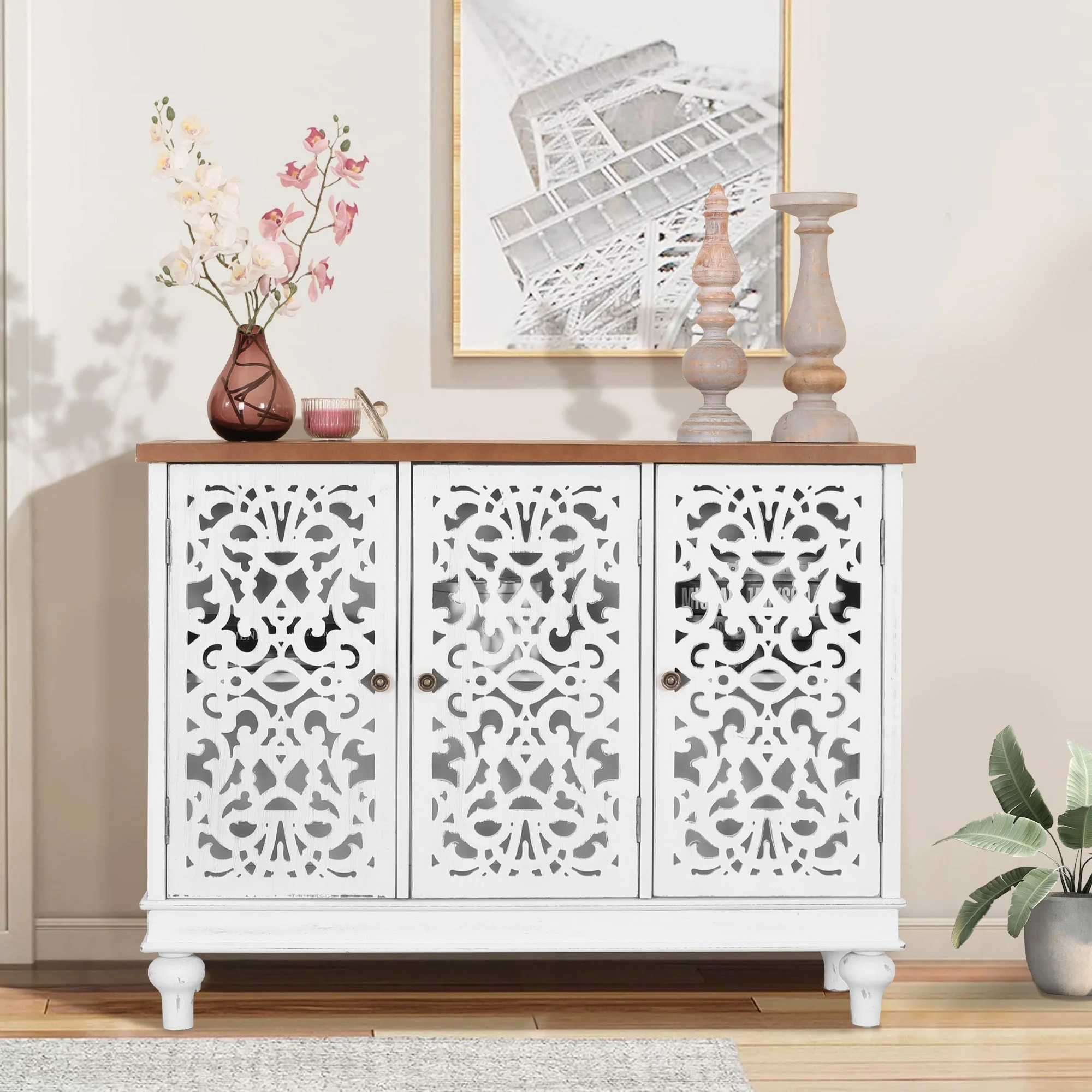 S&W 3-Door Hollow-Carved Sideboard Accent Cabinet for Kitchen, Dining Room, Living Room, Entryway - White