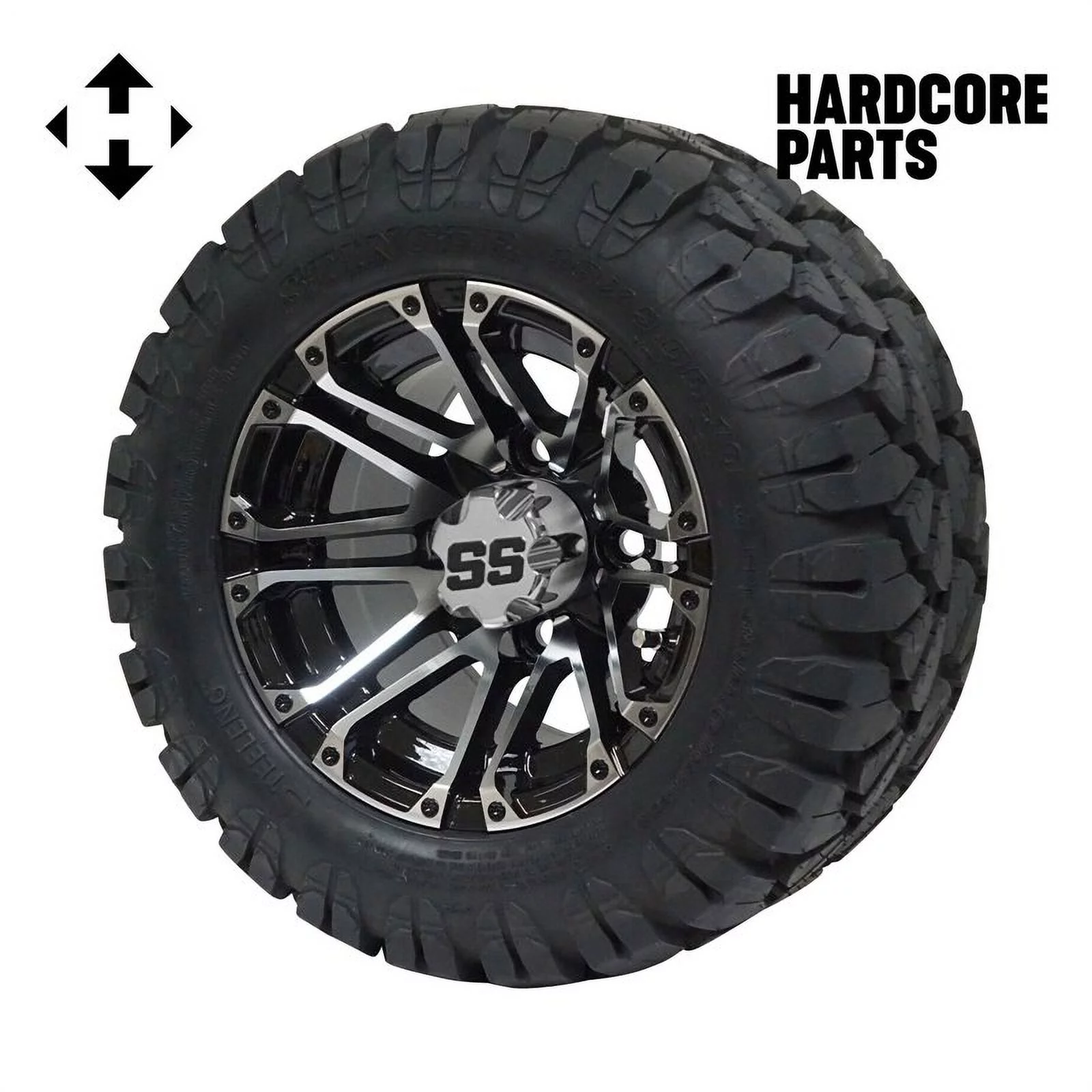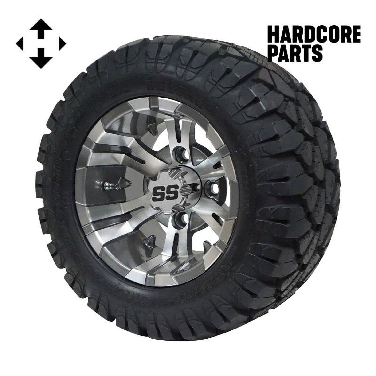 Hardcore Parts 10" Machined/Gunmetal 'Vampire' Golf Cart Wheels & 18″x9″-10″ STINGER On-Road/Off-Road DOT rated All-Terrain tires - Set of 4 includes Chrome 'SS' center caps & M12x1.25 Chrome lug nuts