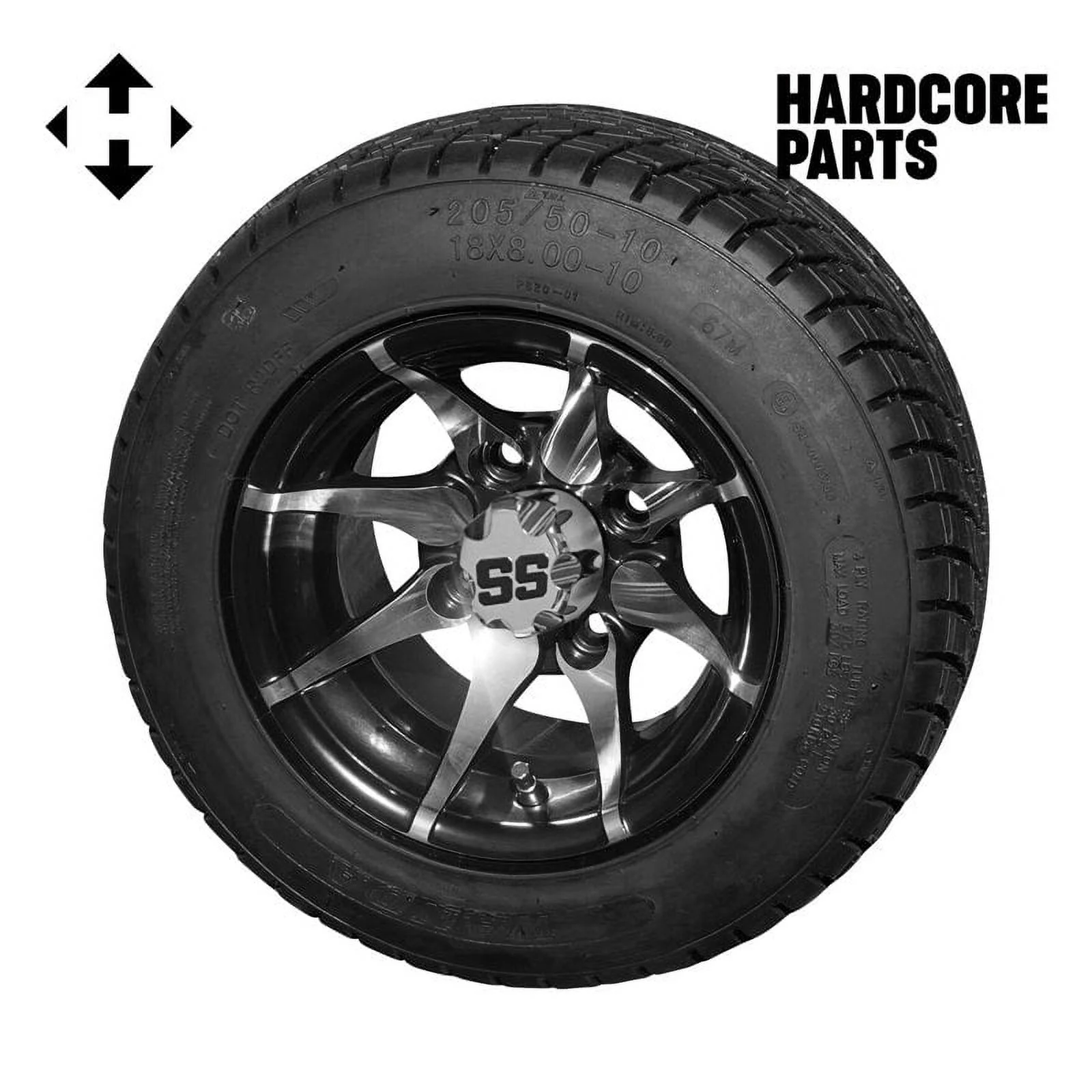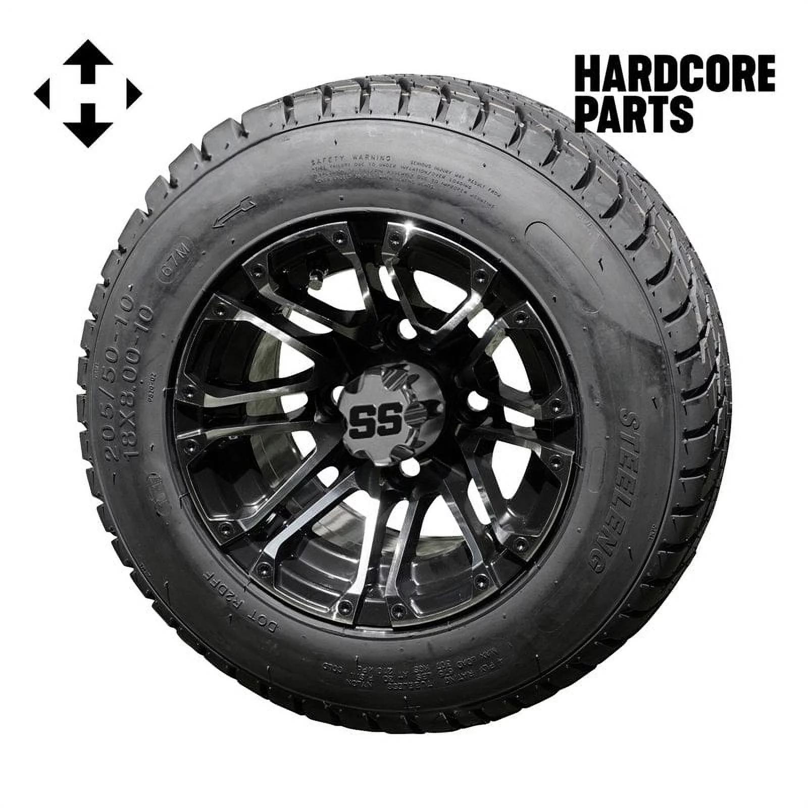 Hardcore Parts 10" Machined/Black 'Lancer' Golf Cart Wheels and 205/50-10 (18″x8″-10″) DOT rated Low Profile tires - Set of 4, includes Chrome 'SS' center caps and M12x1.25 Chrome lug nuts
