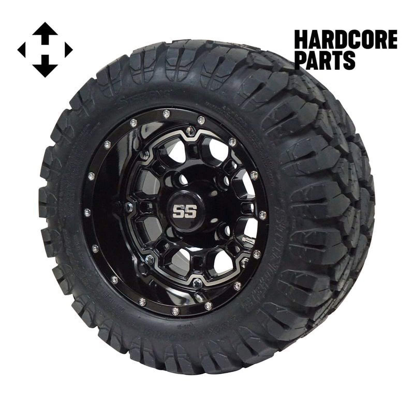 Hardcore Parts 10" Black 'Panther' Golf Cart Wheels and 18"x9"-10 STINGER On-Road/Off-Road DOT rated All-Terrain tires - Set of 4, includes Black 'SS' center caps and M12x1.25 Black lug nuts