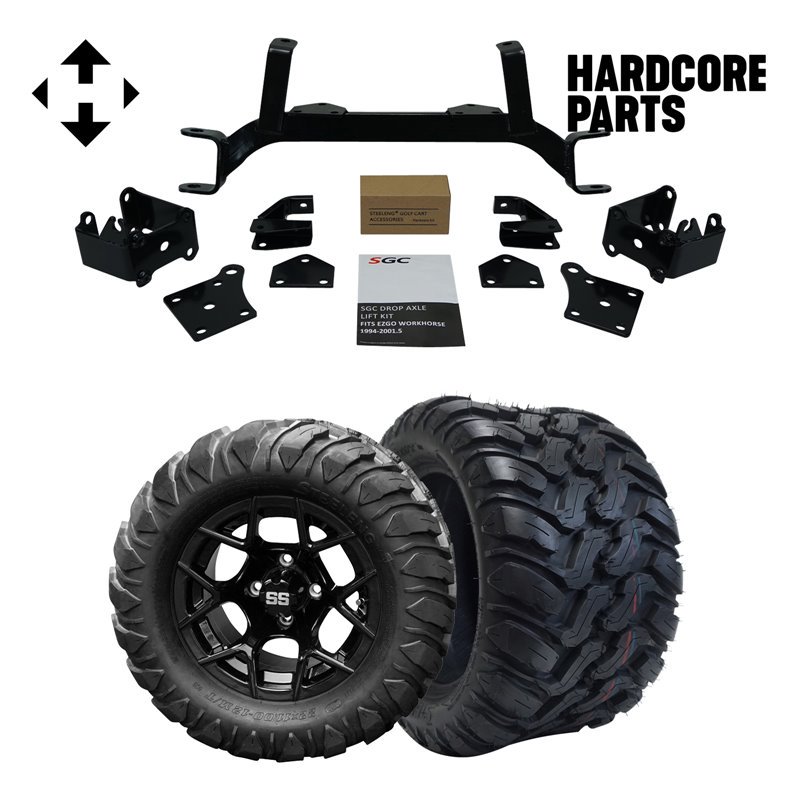 Hardcore Parts 6" Drop Axle Lift Kit for EZGO MPT/WORKHORSE 1200 (1994.5-2001.5) Golf Cart with 12" Black 'Rally' Wheels and 22"x11"-12" DOT rated Mud-Terrain/All-Terrain tires