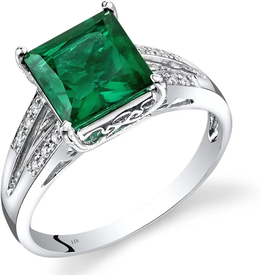 PEORA Created Emerald and Genuine Diamond Ring for Women 14K White Gold, Elegant Cathedral Design, 2.25 Carats Princess Cut 8mm, Size 7