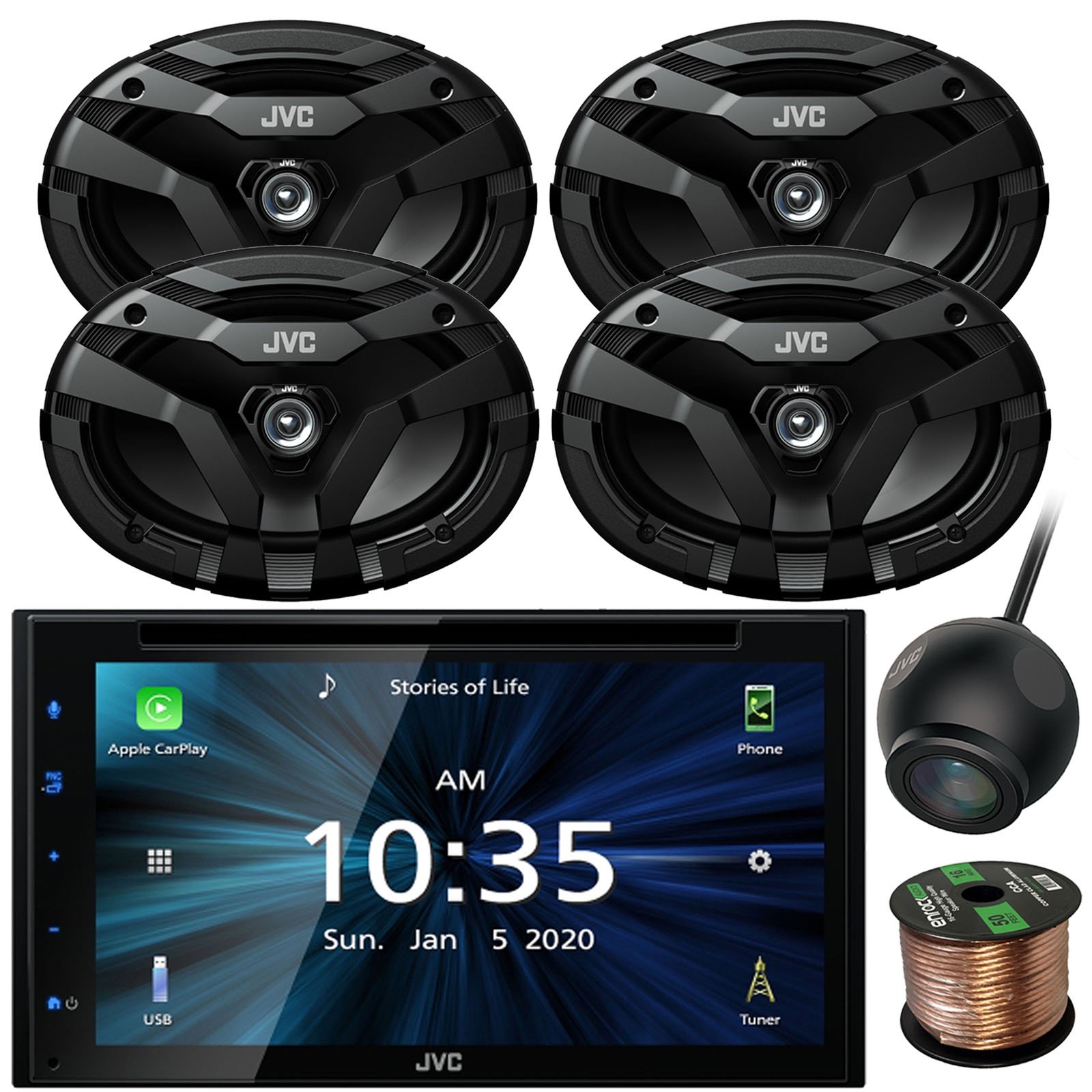 JVC Double DIN 6.8" TouchScreen AM/FM USB Bluetooth DVD Multimedia Stereo Receiver with Waterproof RearView Camera, 4x 6x9" 400 Watt Peak Power 2-Way Car Audio Speakers, 16 Gauge 50 feet Wire