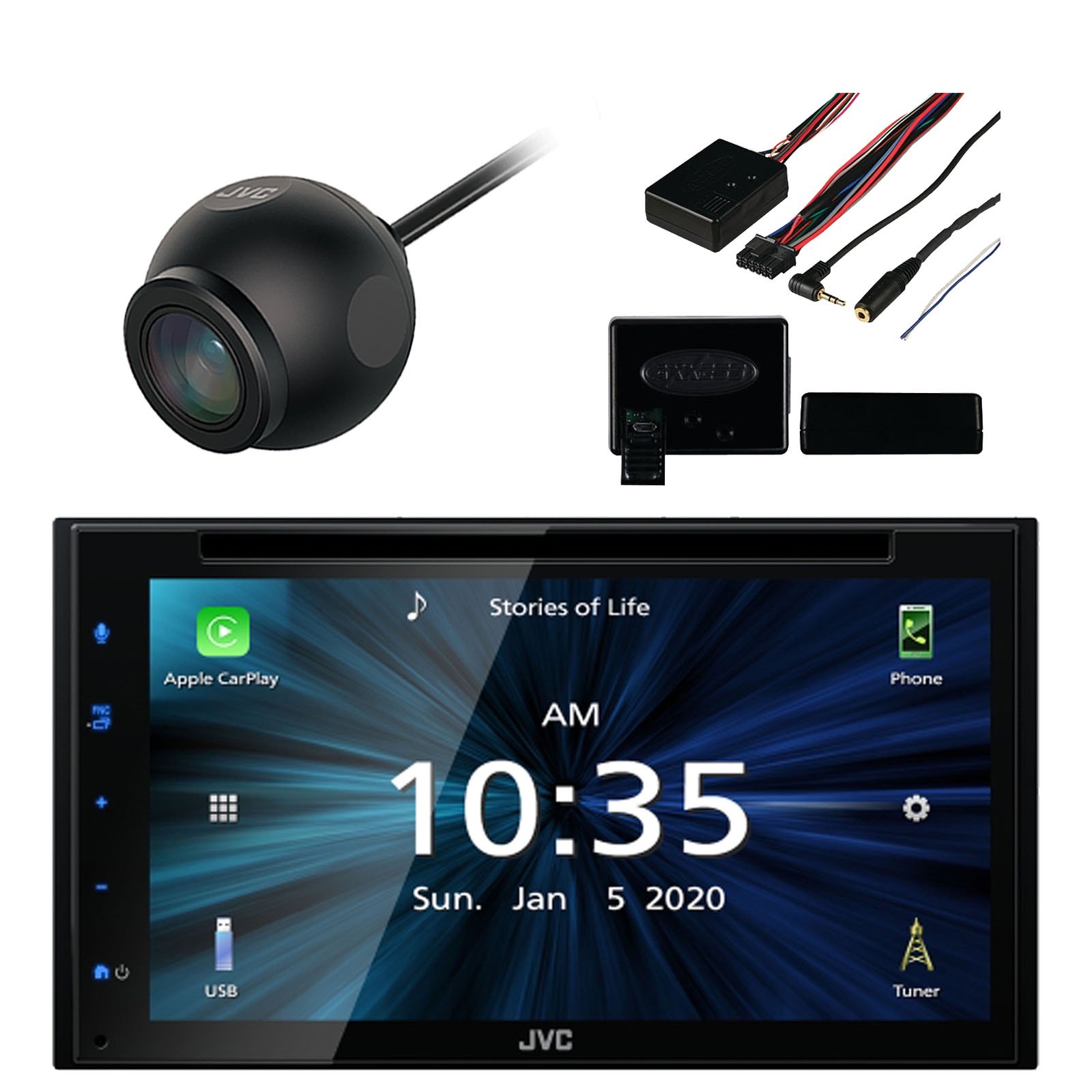 JVC Double DIN 6.8" TouchScreen AM/FM USB Bluetooth DVD Multimedia Car Stereo Receiver with Waterproof RearView Camera and Steering Wheel Control Interface Kit