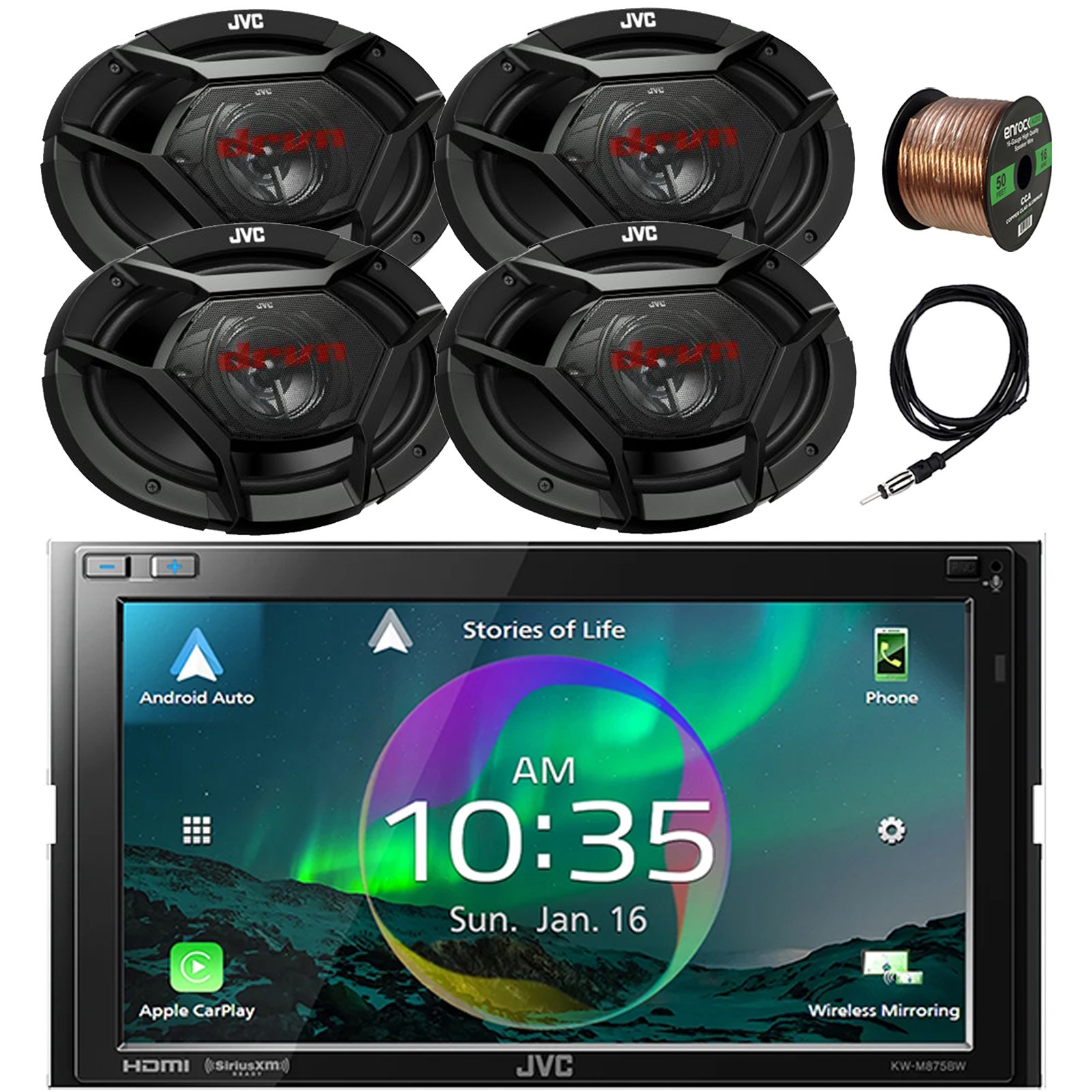JVC Double DIN 6.8" Touchscreen HDMI/WiFi Bluetooth USB Digital Multimedia Car Radio Receiver, 4x 6x9" 500 Watt Max 3-Way Vehicle Audio Speakers, 22" Antenna, 16 Gauge 50 ft Speaker Wire