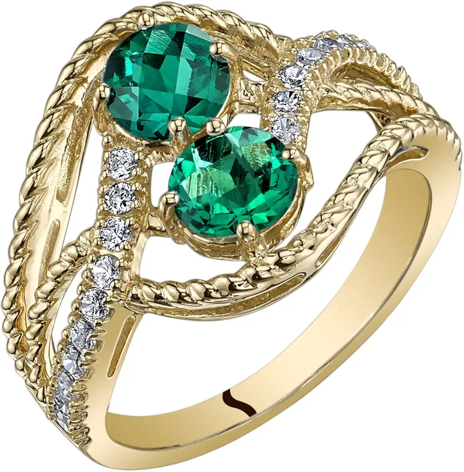 PEORA Created Emerald Two-Stone Ring for Women 14K Yellow Gold, 1 Carat total Round Shape, Sizes 5 to 9