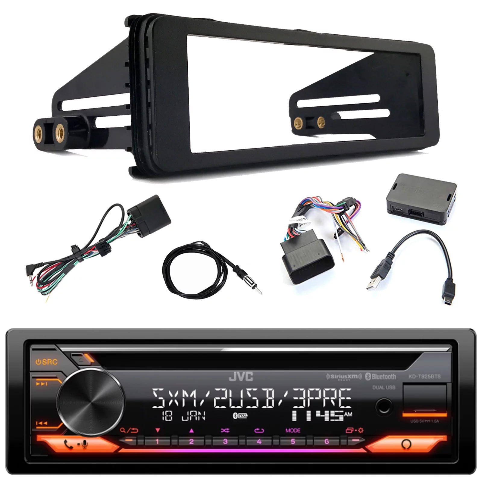 JVC KD-T925BTS Single DIN Bluetooth CD Player USB AUX AM/FM Radio Stereo SiriusXM Ready Amazon Alexa LED Car Audio Receiver, iDataLink Harley Wiring Interface Kit, Dash Kit, Radio Antenna