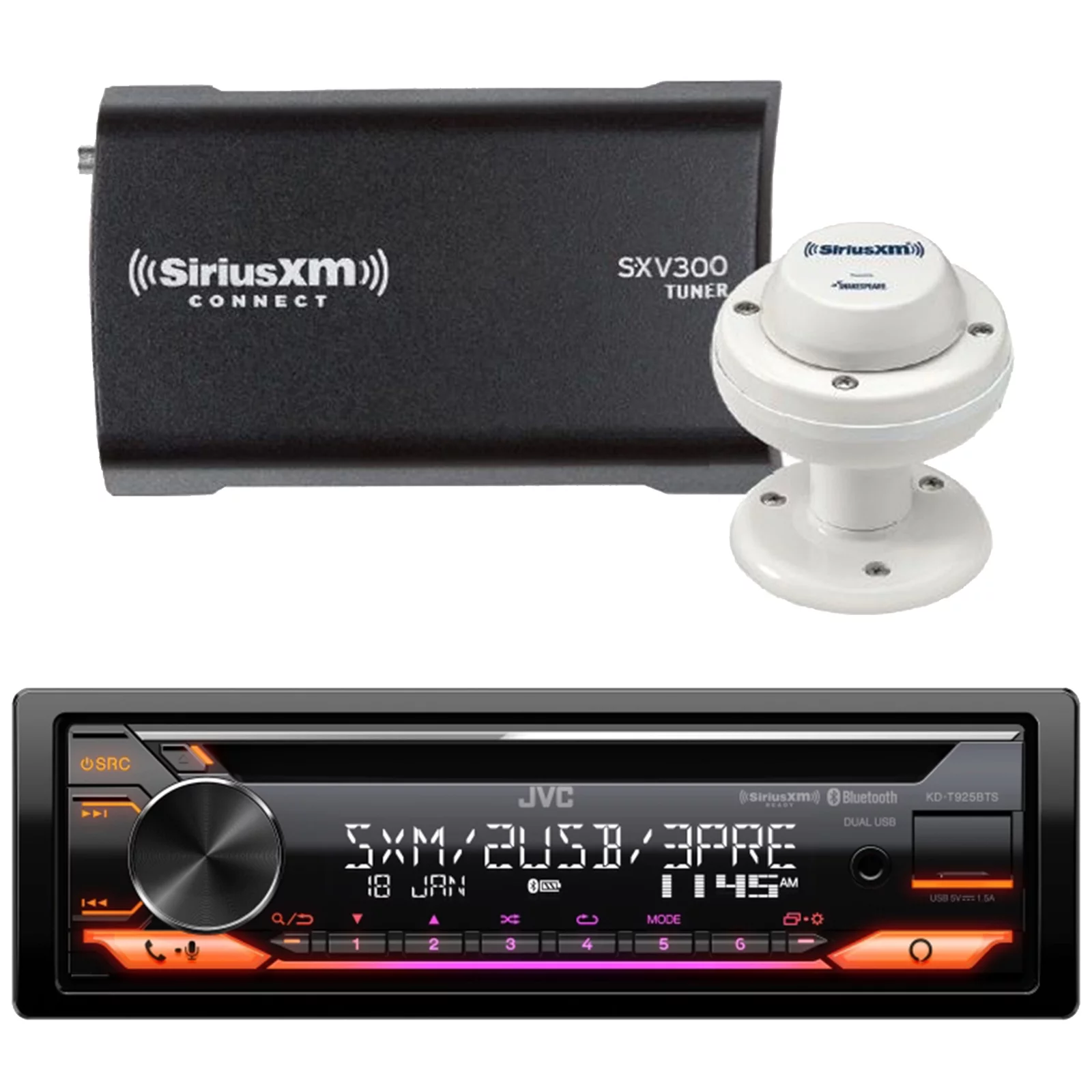 JVC KD-T925BTS Single DIN Bluetooth CD Player USB AUX AM/FM Radio Stereo SiriusXM Ready Amazon Alexa LED Illumination Car Audio Receiver Satellite Radio Tuner Bundle with SRA50 Marine/RV Antenna