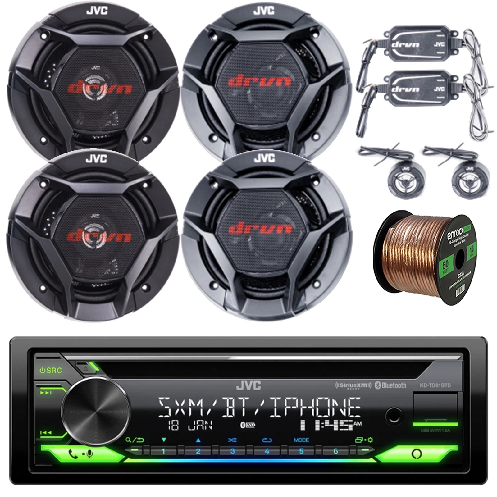 JVC KD-TD91BTS Single DIN CD Player Bluetooth USB AUX AM/FM Radio Receiver Bundle with 2x 6.5" 2-Way 360W Peak Car Audio Component Speakers, 2x 6.5" Coaxial 300W Max Vehicle Speakers, Speaker Wire
