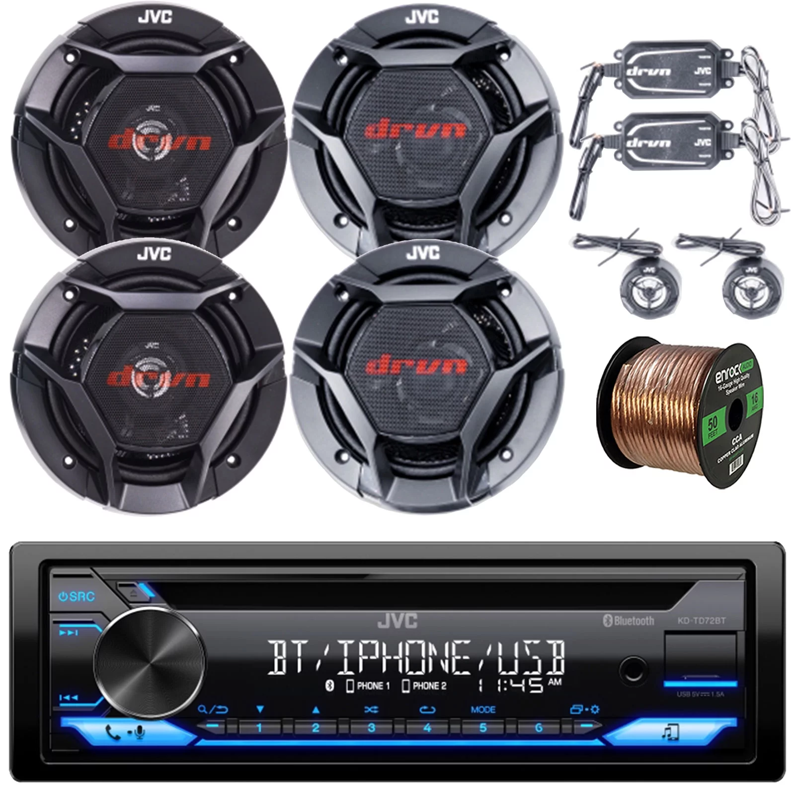 JVC KD-TD72BT Single DIN Bluetooth USB AUX AM/FM Radio CD Player Receiver Bundle with 2x 6.5" 2-Way 360W Peak Car Audio Component Speakers, 2x 6.5" Coaxial 300W Max Vehicle Speakers, Speaker Wire