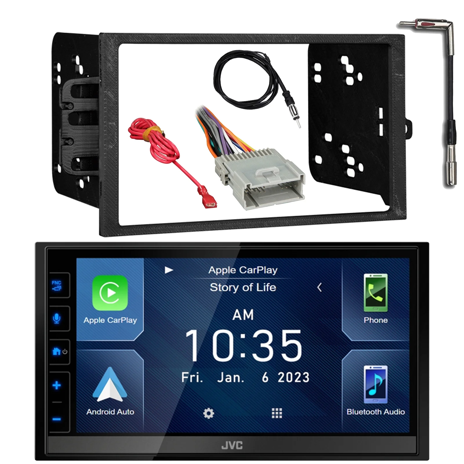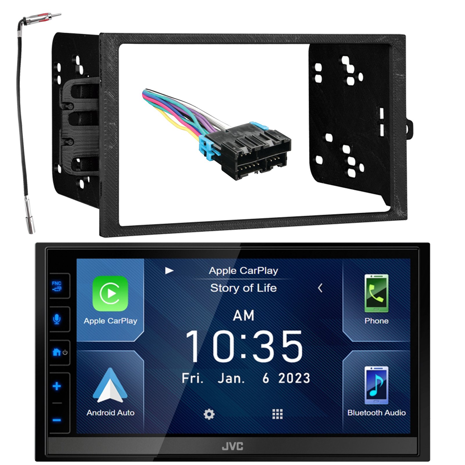 JVC KW-M788BH Double DIN 6.8" Touchscreen HDMI Bluetooth AM/FM/HD Radio Digital Media Car Receiver with Dash Installation Kit, 22" Antenna w/Adapter and Wiring Harness (fits select 98-06 GM Vehicles)