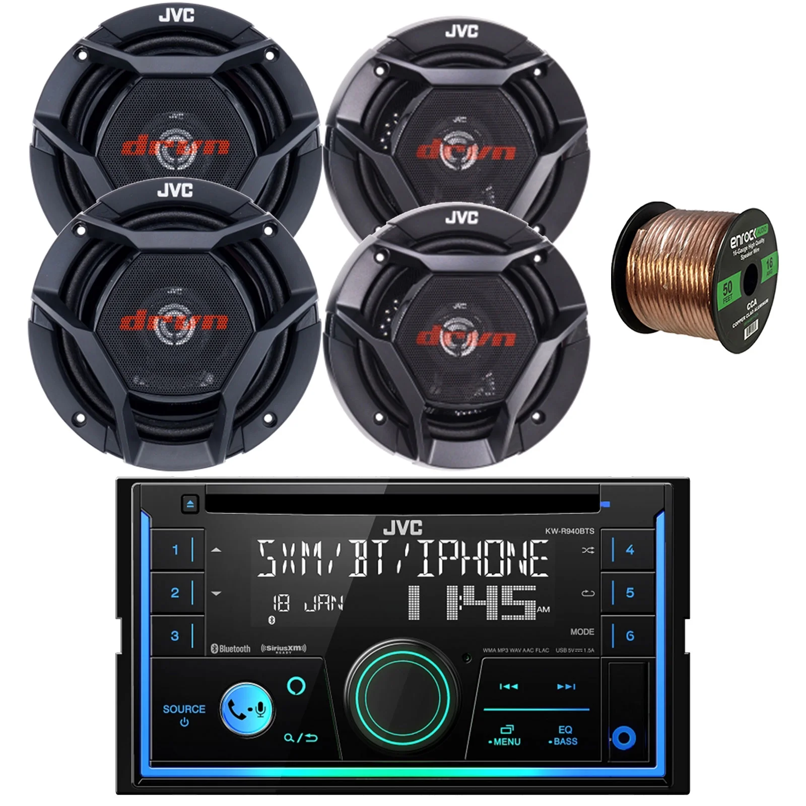 JVC KW-R940BTS Double DIN Bluetooth USB AUX AM/FM Stereo CD Player Receiver Bundle with 2x 5.25" 2-Way Coaxial 260W Peak Car Audio Speakers, 2x 6.5" Coaxial 300W Max Vehicle Speakers, Speaker Wire