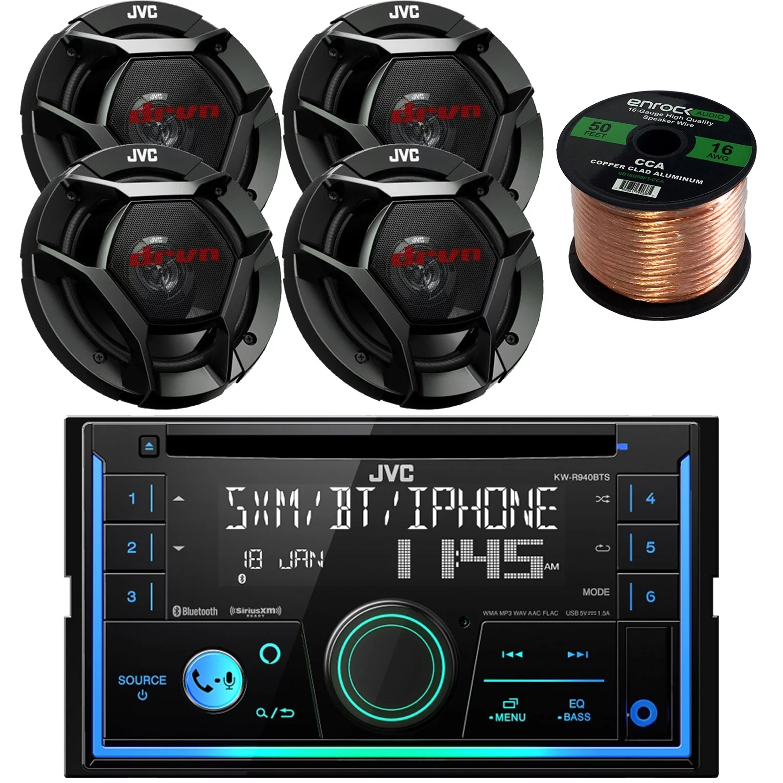 JVC KWR940BTS Double DIN Bluetooth Car Stereo CD Receiver Bundle Combo With 4x JVC CSDR621 6.5" Inch 300-Watt 2-Way Audio Coaxial Speakers + Enrock 50 Foot 16 Gauge Speaker Wire