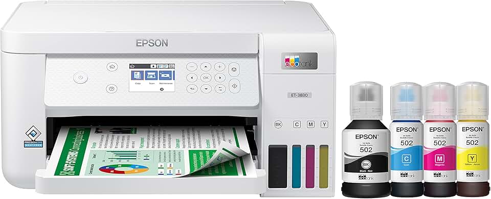 Epson EcoTank ET-3830 Wireless Color All-in-One Cartridge-Free Supertank Printer with Scan, Copy, Auto 2-Sided Printing and Ethernet – The Perfect Printer Productive Families,White