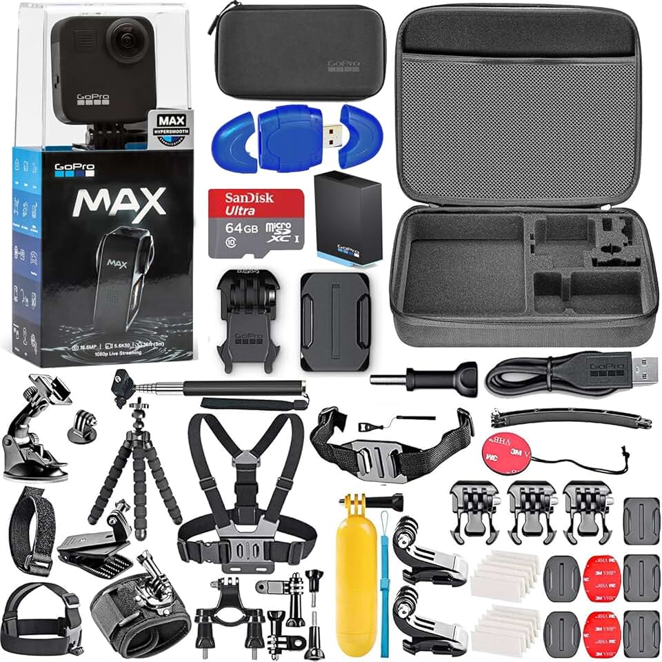 GoPro MAX 360 Waterproof Action Camera 5.6K30 HD Video 16.6MP 360 Photos + 64GB Memory Card, High Speed Card Reader + Max Action Bundle (59 Items) Black
