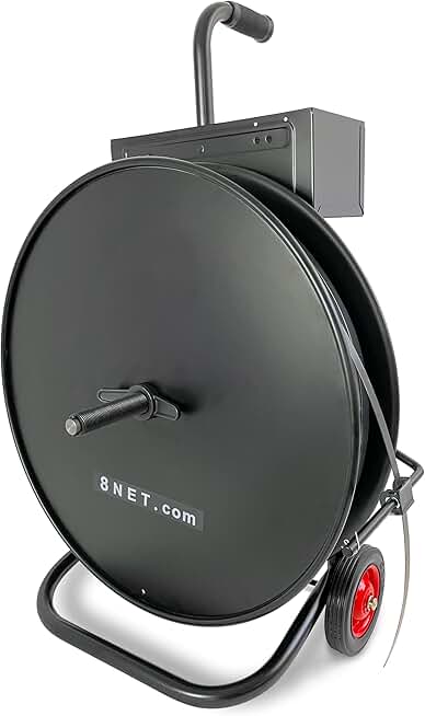 8 NET Black Heavy Duty Strapping Dispenser for Poly, Polyester and Steel Strapping, Deluxe Strapping Cart, Accepts Dia. Core 8’’ or 16’’