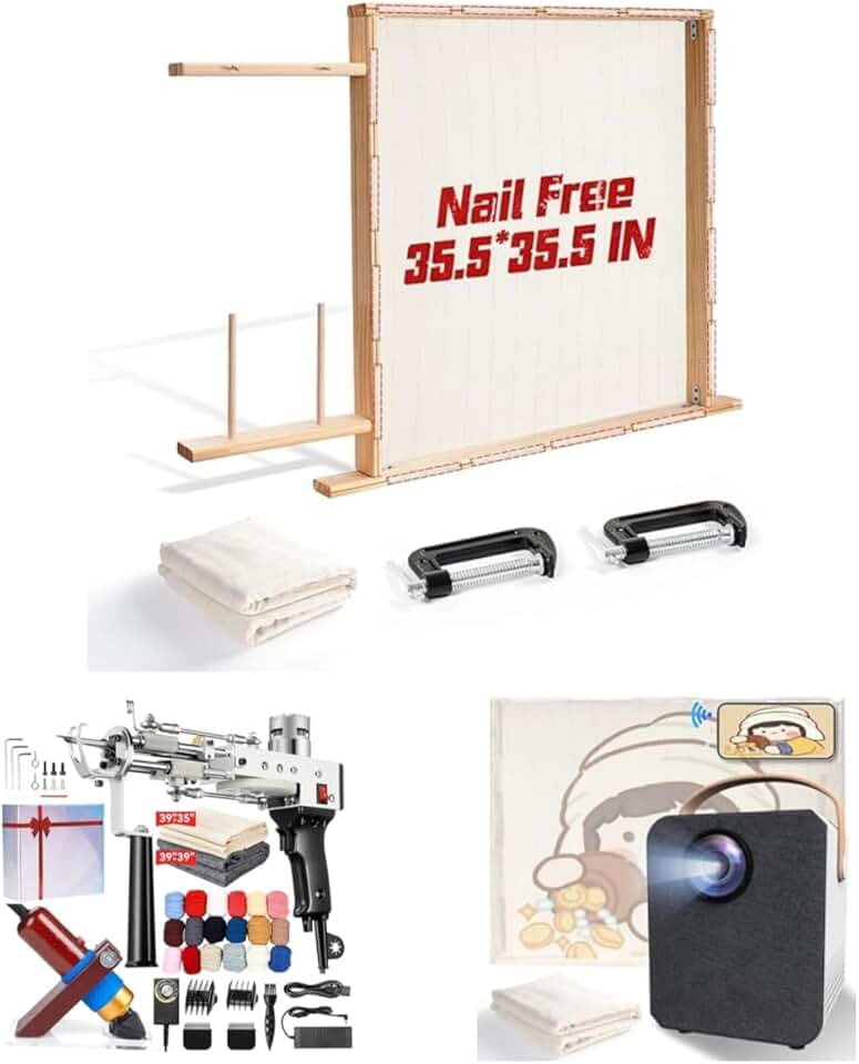 BESGEER 35.55” x 35.55” Rug Wooden Tufting Frame, 2 in 1 Rug Tufting Gun with Carpet Trimmer, Rug Tufting Kit with Projector 39"*39" Tufting Cloth