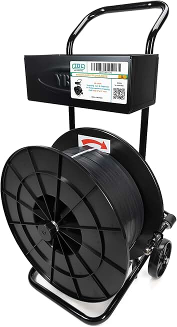 8 NET Black Heavy Duty Strapping Dispenser for Poly, Polyester and Steel Strapping, Deluxe Strapping Cart, Accepts Dia. Core 8’’ or 16’’