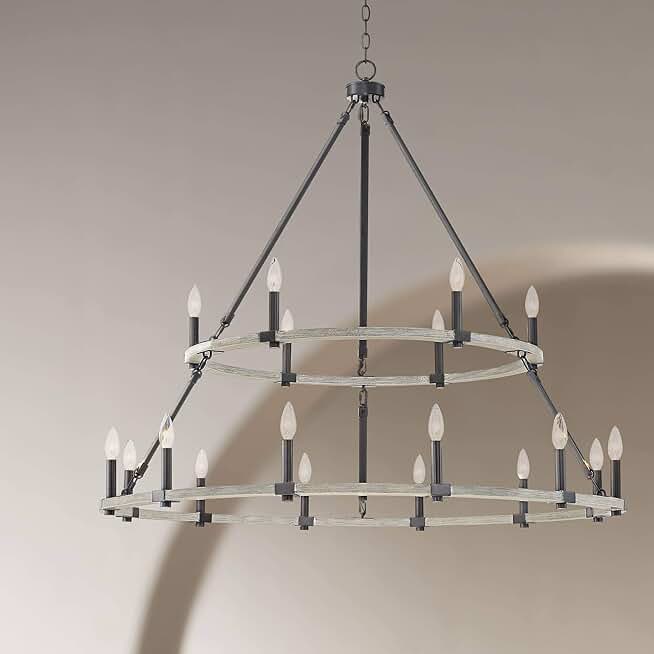Franklin Iron Works Caroline Black Painted Wood Finish Large Round Chandelier 46 1/4" Wide Rustic Farmhouse Ring 2 Tier 18-Light Fixture for Dining Room House Foyer Entryway Kitchen Bedroom