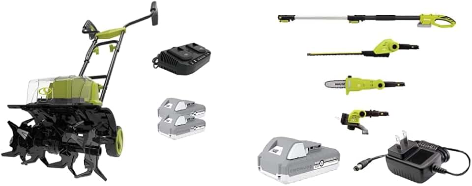 Sun Joe Cordless Garden Tiller/Cultivator Kit | W/ 2 x 2.0-Ah Batteries and Charger & GTS4002C Cordless Lawn Care System-Hedge Trimmer, Pole Saw, Grass Trimmer | 40.7 x 2 x 3 in |