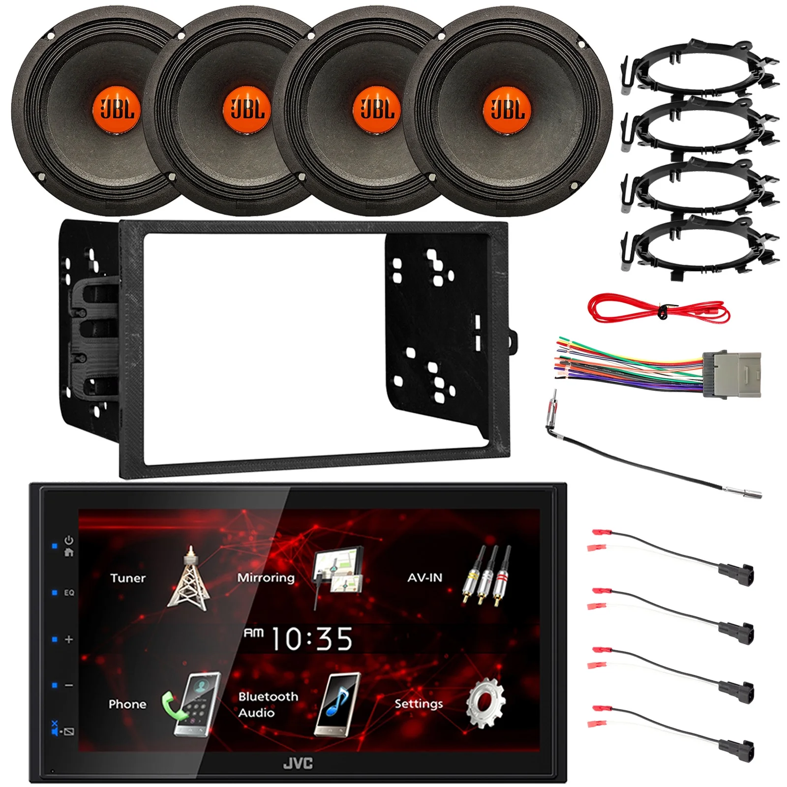 JVC KW-M180BT 6.8" Touchscreen Double DIN Bluetooth USB Stereo Receiver, 4x 6.5" 300W Car Speakers w/Adapters, Radio + Speaker Harness, Antenna Adapter, Install Kit For Select 95-Up GM Vehicles