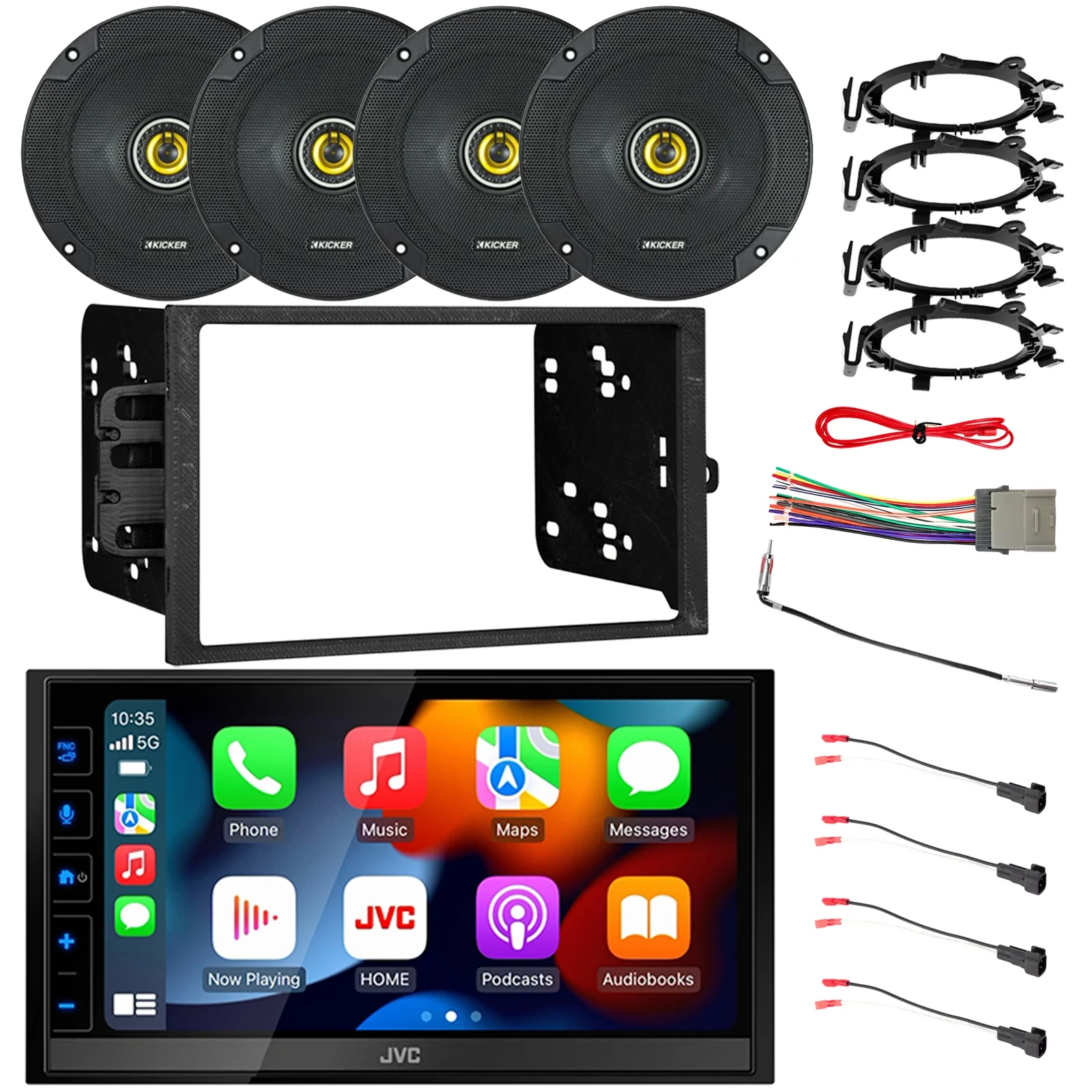 JVC KW-M780BT 6.8" Touchscreen HDMI Bluetooth USB Stereo Receiver, 4x Kicker CSC65 6.5" 300W Car Speakers w/Adapters, Radio + Speaker Harness, Antenna Adapter, Install Kit For Select 95-Up GM Vehicles