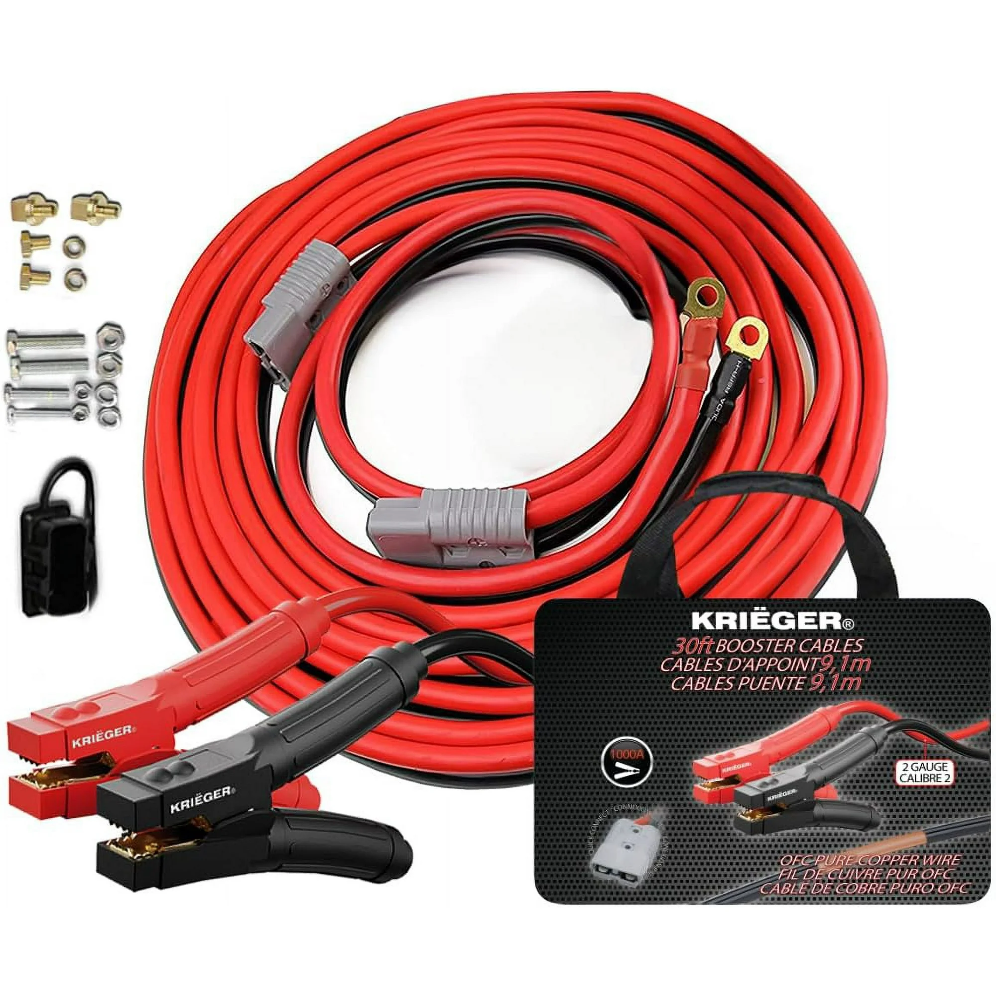 K KRIGER Jumper Cables 100% Pure Copper, 30 Feet, 2 Gauge, 800 Amp Custom-Made Alligator Clamps, Booster Battery Cables w/Permanent Installation kit & Quick Connect Plugs - Carrying Bag Included