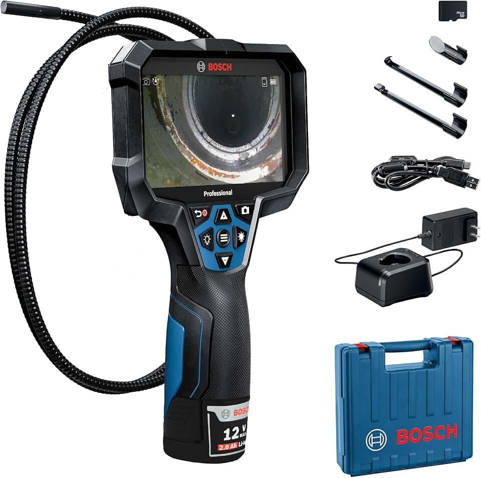 BOSCH GIC5-27C Professional Borescope Inspection Camera with Adjustable LED Light, 11ft. Removable Endoscope Camera, Up Indicating Arrow, Includes 12V Rechargeable Battery, Carrying Case, Attachments
