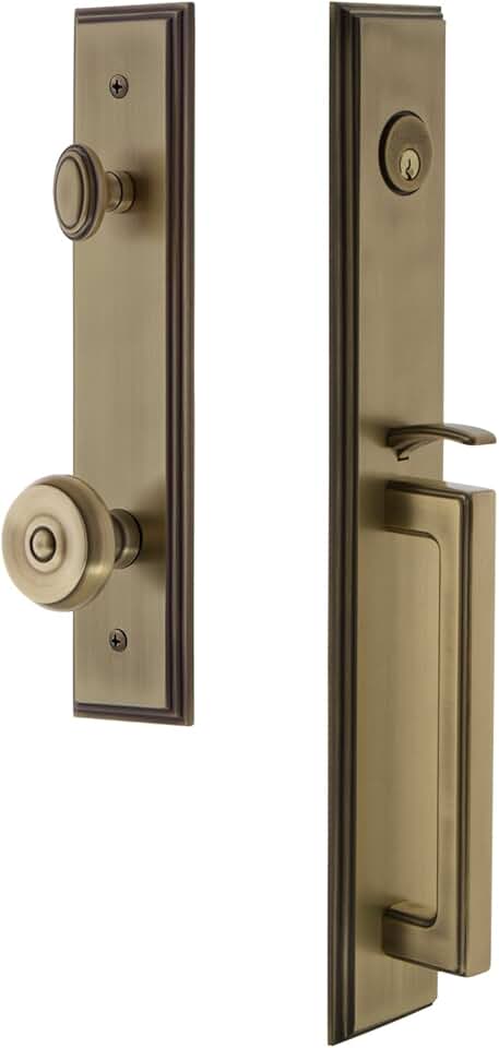 844791 Hardware Carre' One-Piece Handleset with D Grip and Bouton Knob, Backset Size-2.375", Vintage Brass