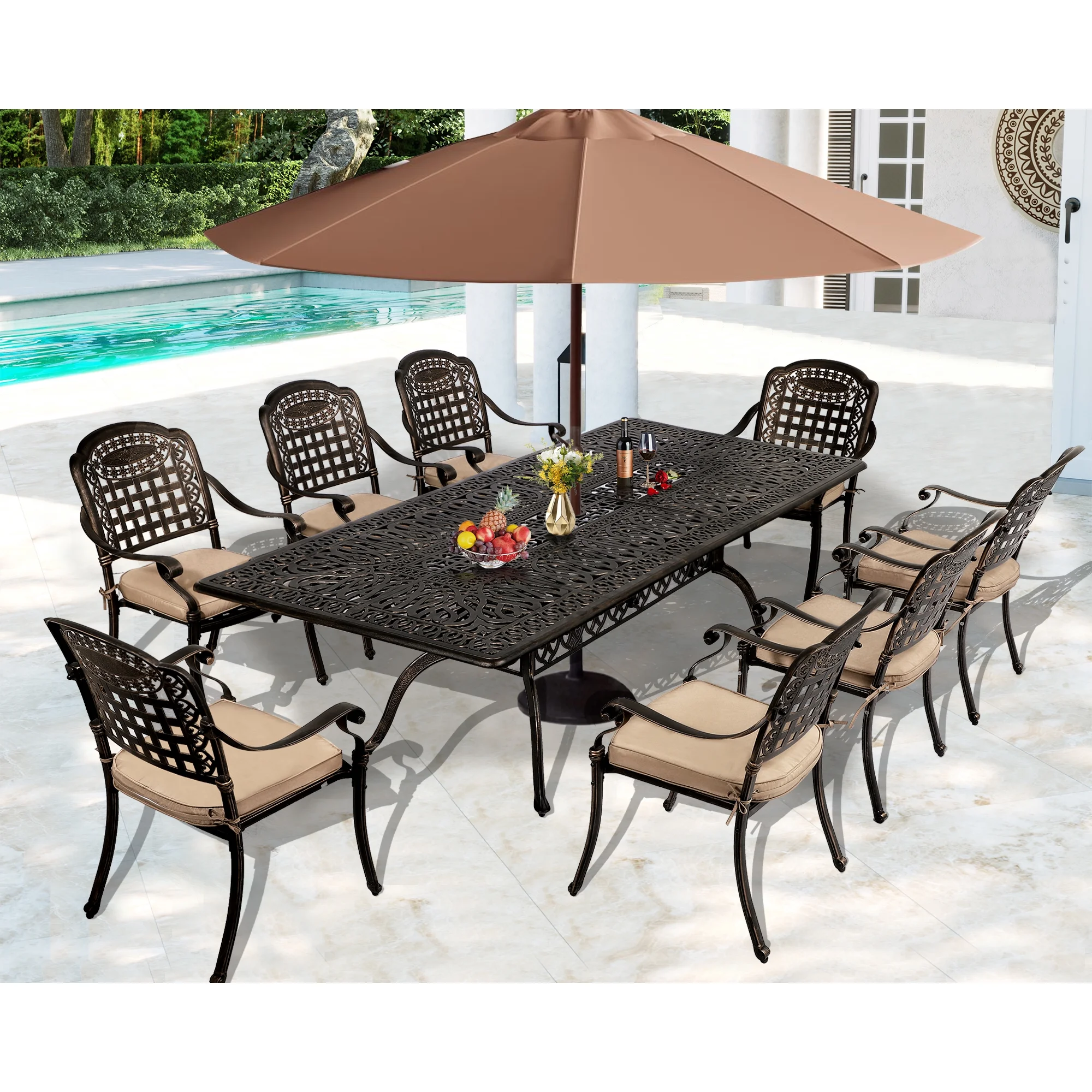 Magic Union 9 Piece Cast Aluminum Patio Furniture Set Outdoor Dining Set Bistro Furniture Set with 8 Armchairs and Dining Table, 8 Cushions(8 Grid Chairs)