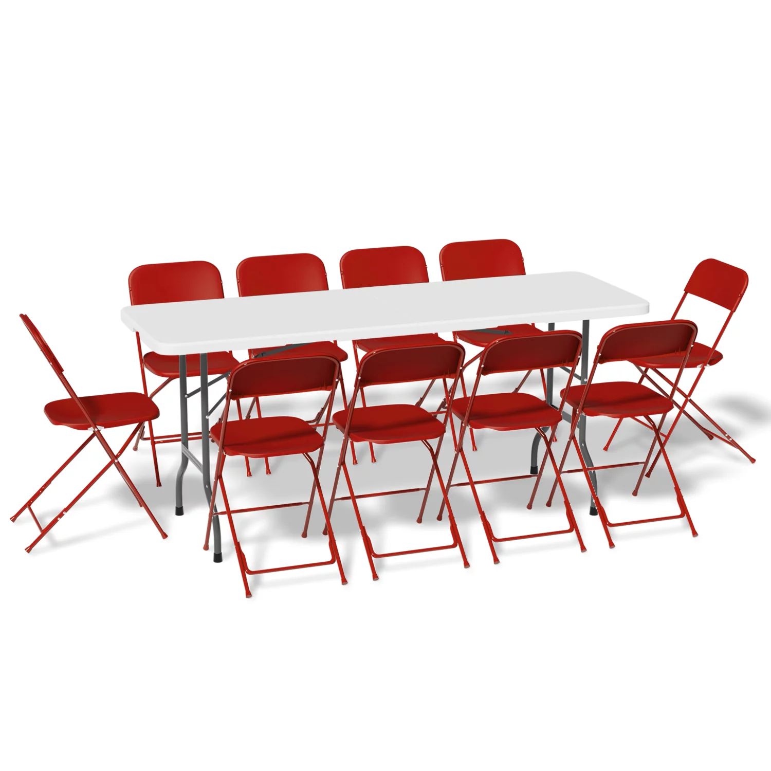 Magshion 11 Pieces 5.5 Ft White Plastic Folding Table with 10 Red Foldable Chairs Set for Picnic, Training, Outdoor Activities