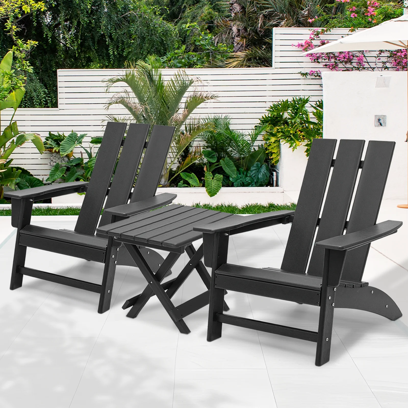 Magshion 3 Pieces Adirondack Chair with Table, HDPE Fire Pit Chairs and Folding Side Table, Outdoor Patio Furniture Set with Slatted Seat, High Backrest and Wide Armrests, Black