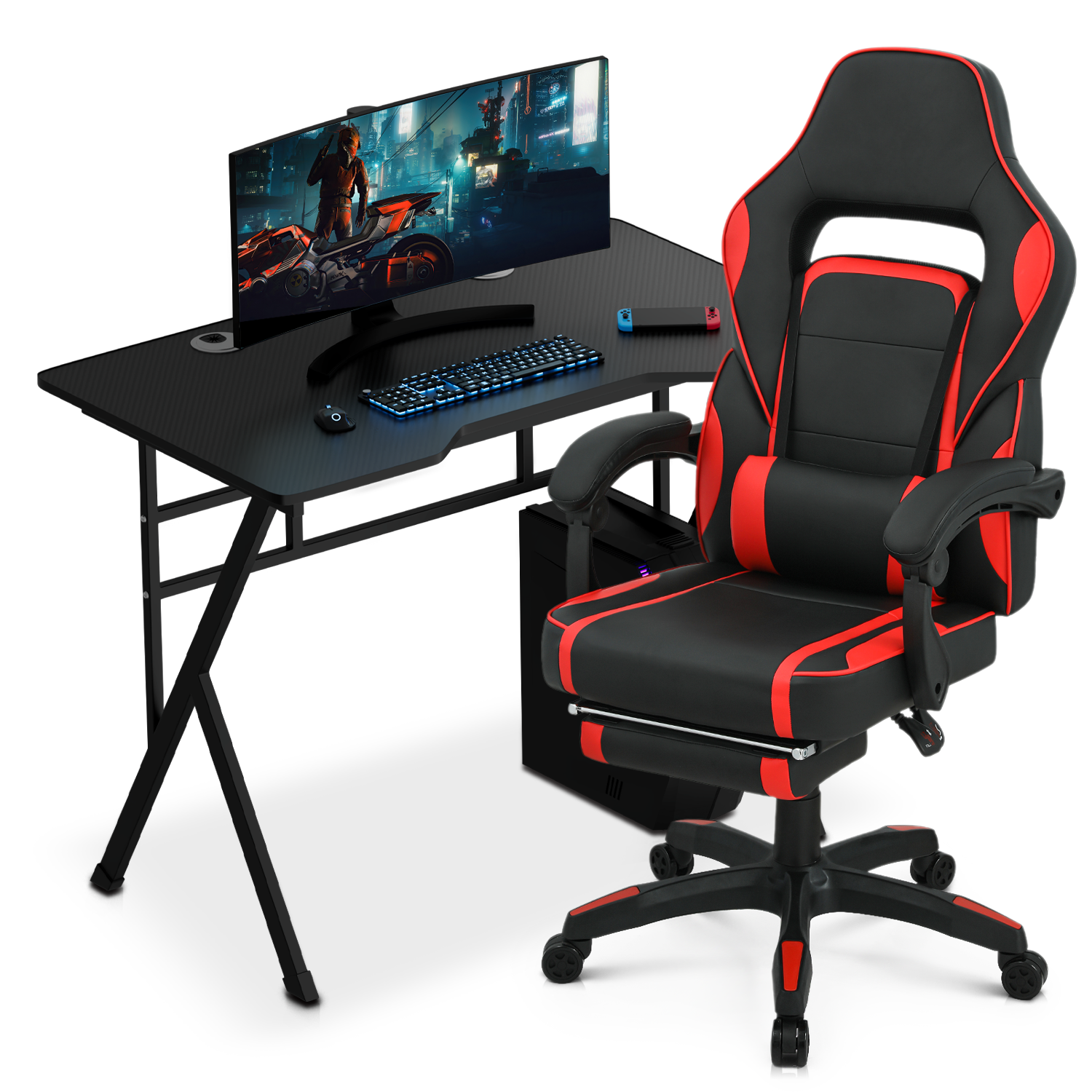 Magshion Computer Desk & Chair Set, Laptop Table with Cable Management Grommet and Adjustable Gaming Chair Recliner with Retractable Footrest & Lumber Support, Red