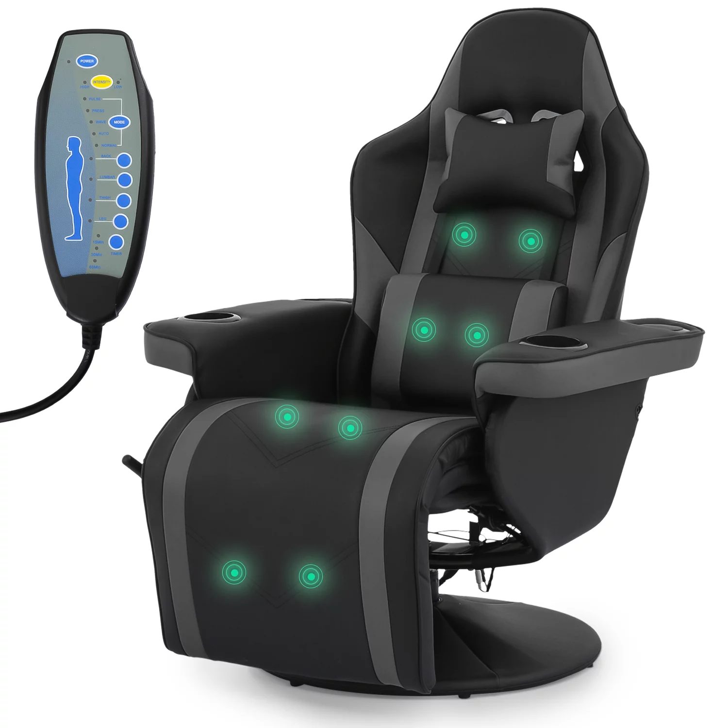 Magshion Racing Gaming Chair with Adjustable Footrest and Backrest, Ergonomic Recliner High Back Swivel Chair with Massage, Lumbar Support, Headrest and Cupholders, Grey