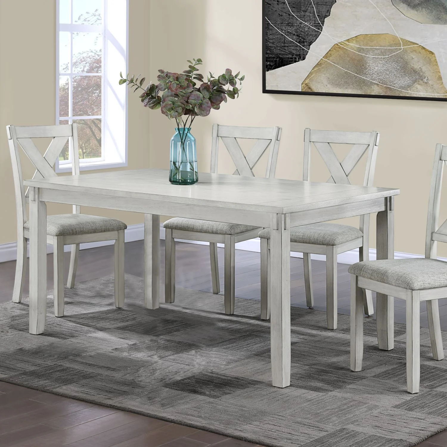 Rustic Farmhouse Transitional 5-Piece Dinette Dining Set Rectangular Table Linen Look Fabric Upholstered Chair Seat Wooden Dining Room Furniture White/Gray Drift Wood Finish