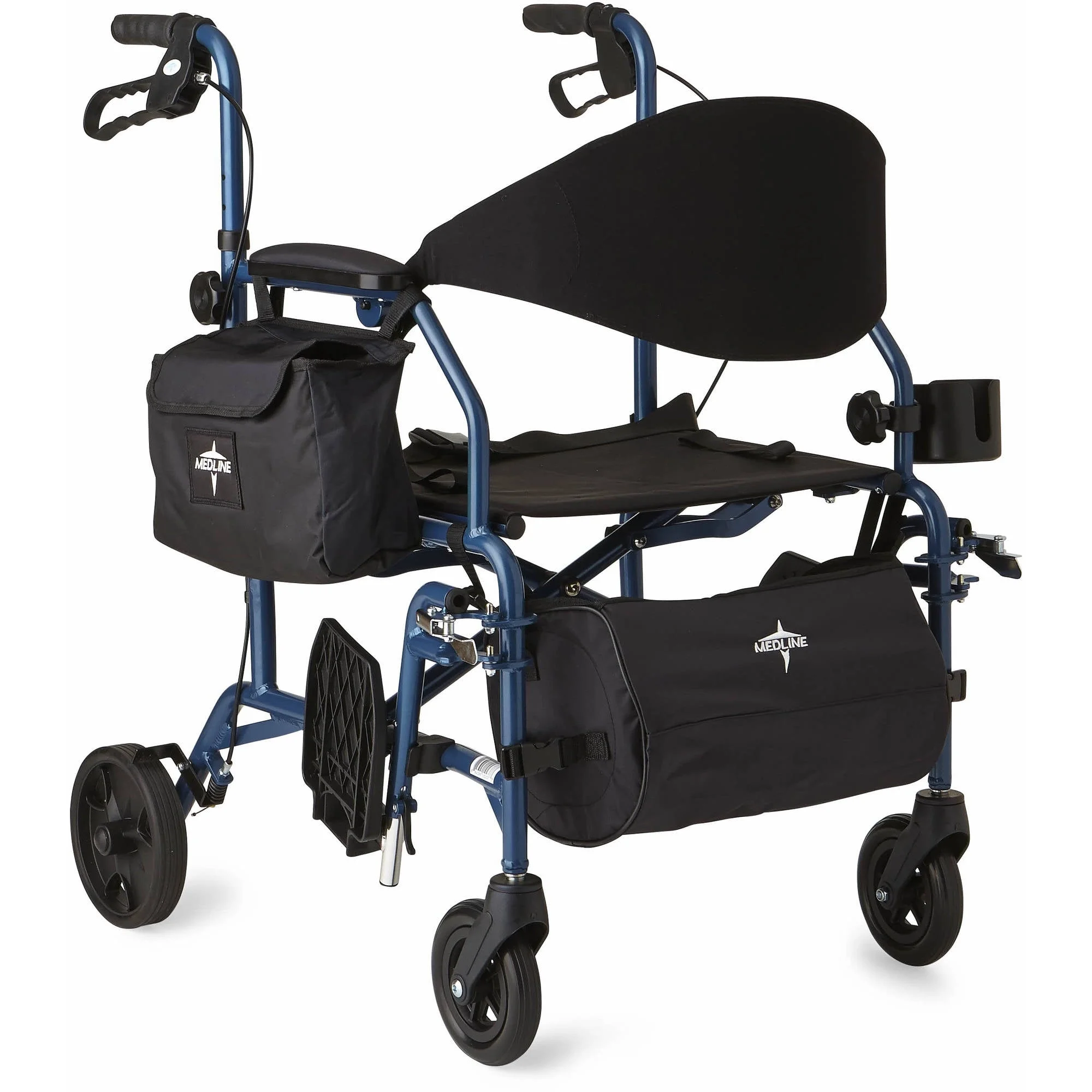 Medline Combination Rollator Transport Wheelchair, Folding Rolling Walker Wheel Chair, 6" Wheels, 250lb Weight Capacity, Blue Frame