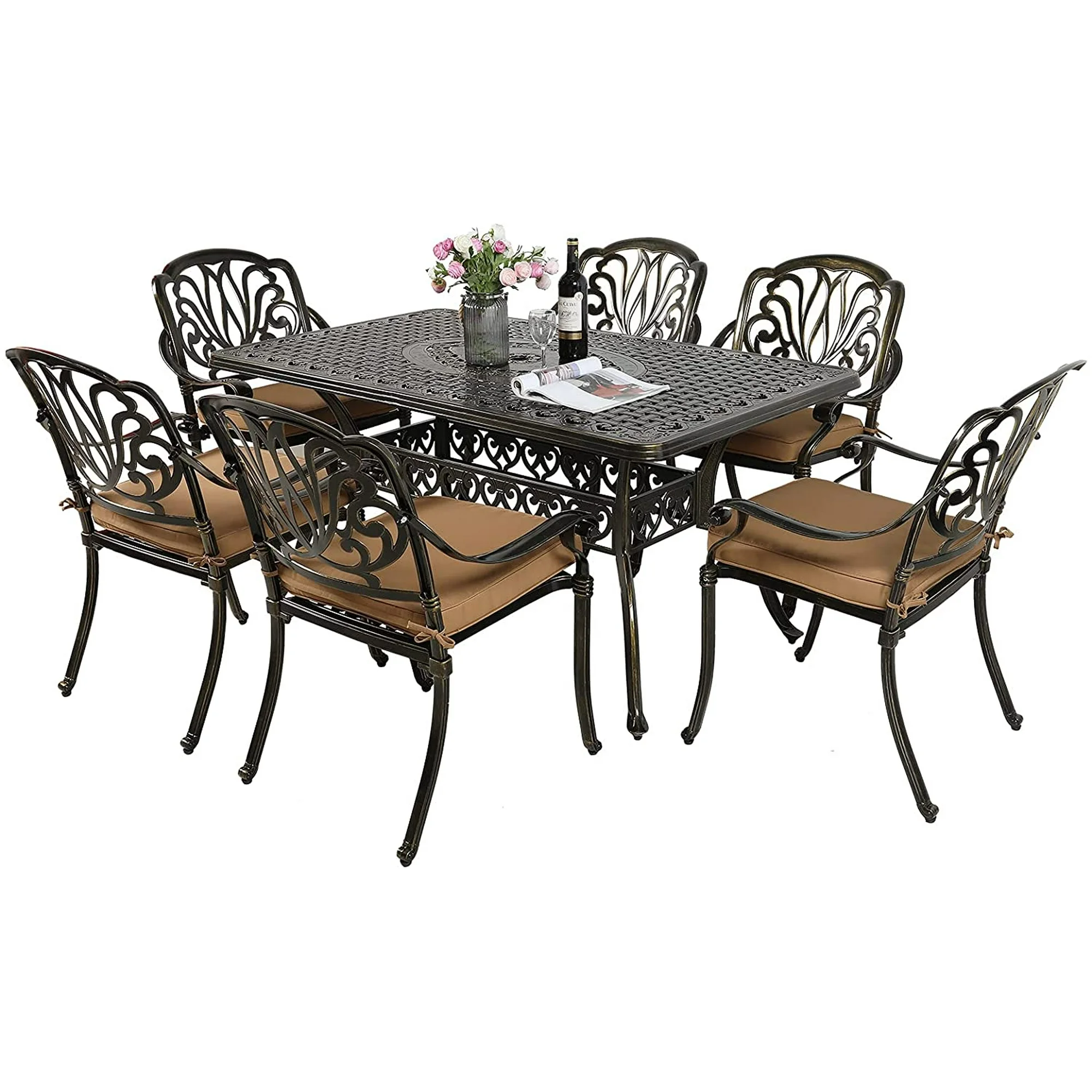 MEETWARM 7-Piece Outdoor Furniture Dining Set, All Weather Cast Aluminum Patio Garden Set with 6 Cushioned Chairs, 1 Rectangular Table, 2" Umbrella Hole, Dark Bronze