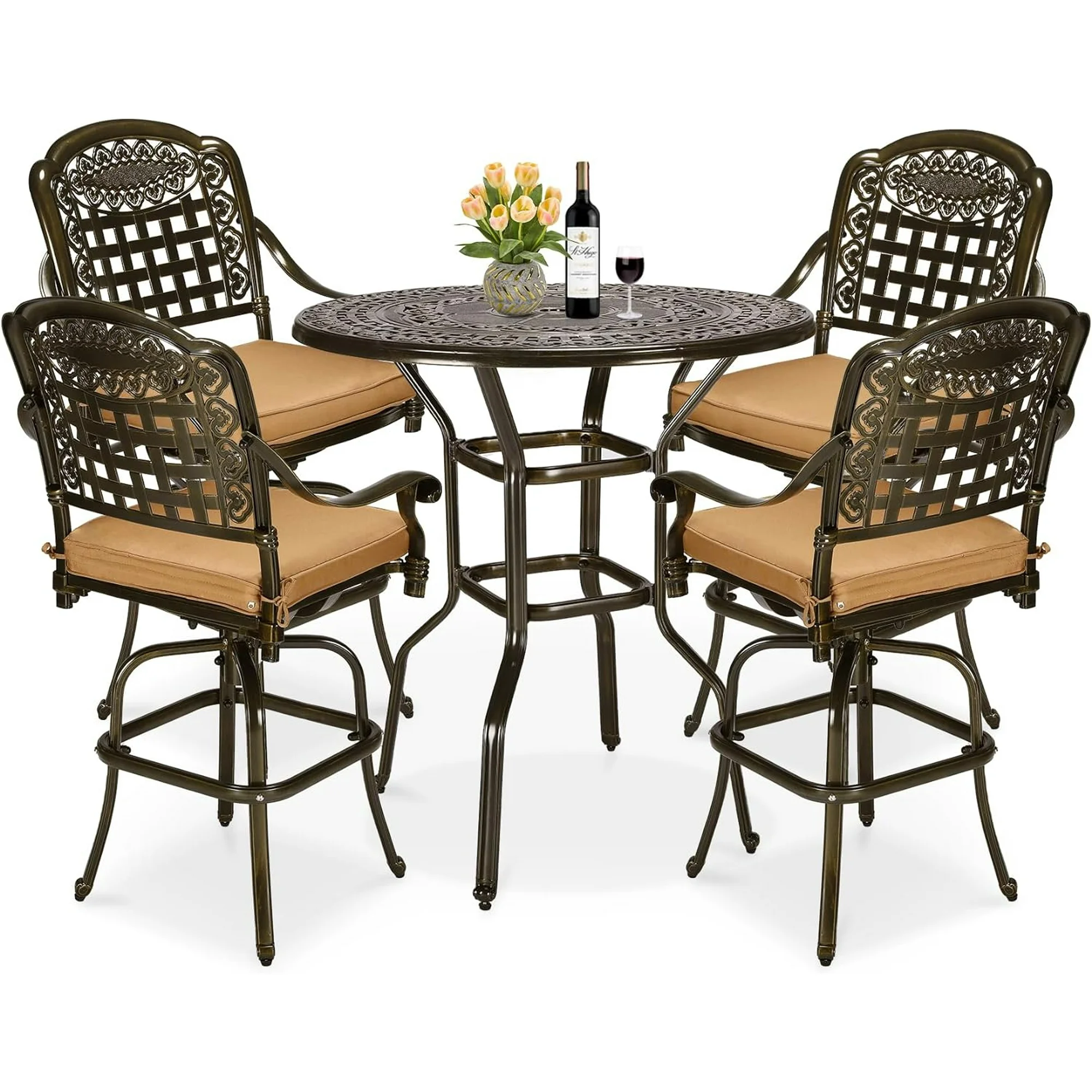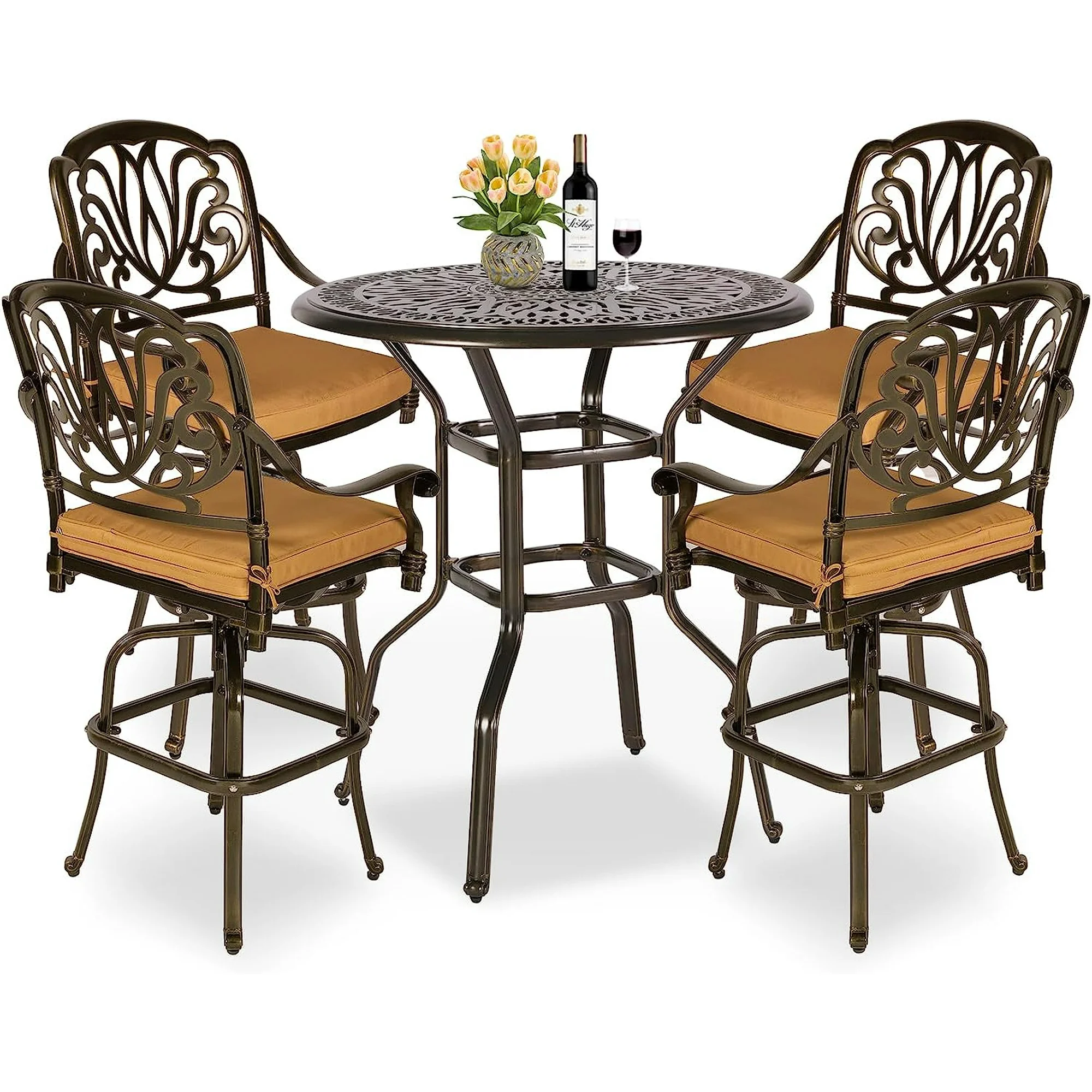 MEETWARM 5-Piece Patio Swivel Bar Set, All-Weather Cast Aluminum Outdoor High Bar Stool Bistro Set for Backyard Garden with 4 Cushions Bar Chairs with Footrest and 35.4" Bar Table, 2" Umbrella Hole