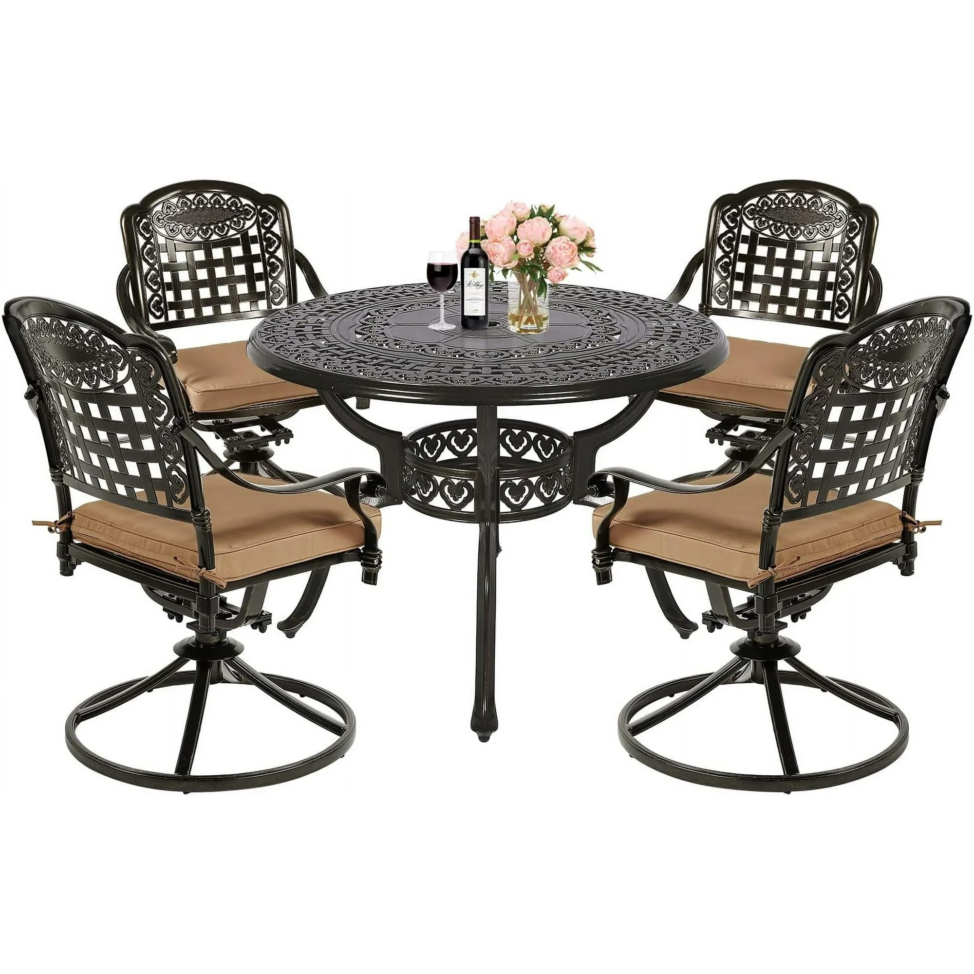 MEETWARM 5-Piece Outdoor Patio Dining Set, All-Weather Cast Aluminum Patio Conversation Set with 4 Cushions Swivel Rocker Chairs for Backyard Garden Deck and 38.5" Round Table, 2.2" Umbrella Hole