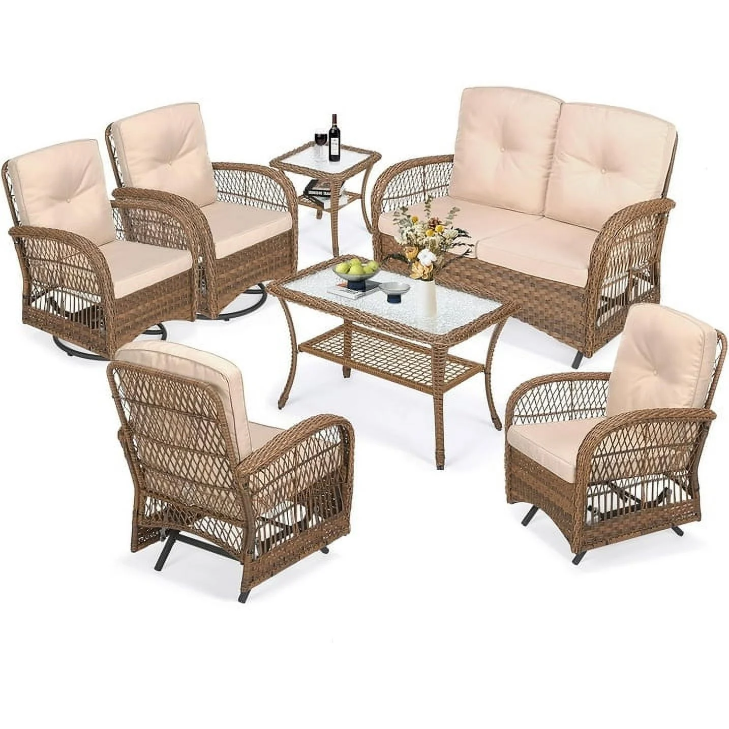 MEETWARM 7 Pieces Outdoor Patio Rattan Furniture Sets, All Weather Patio Wicker Conversation Set- 2 Rocking Glider, 2 Swivel Chairs, 1 Loveseat Glider with Cushions, 2 Glass-Top Coffee Table, Beige