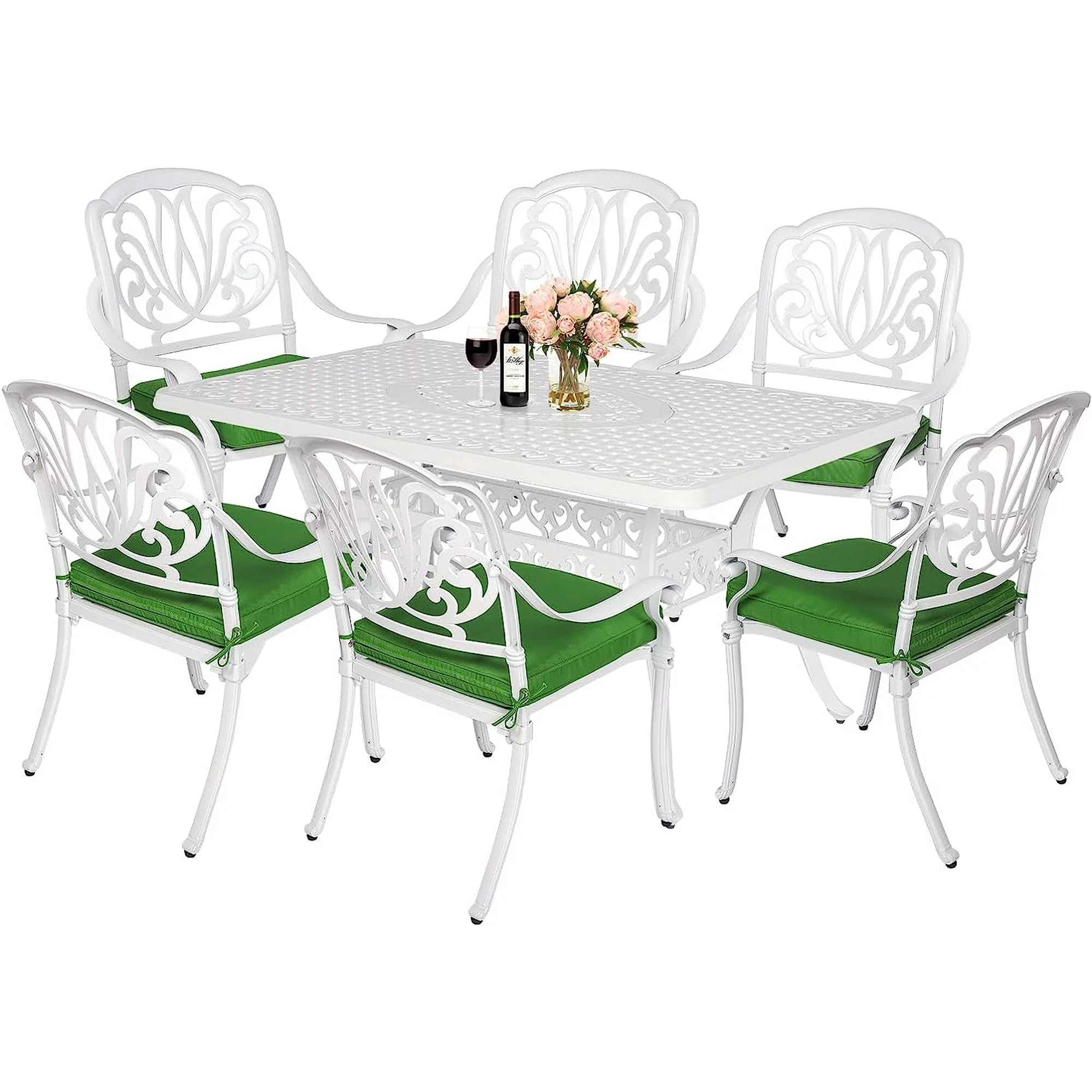 MEETWARM 7-Piece Outdoor Patio Dining Set, 6 Outdoor Dining Cushioned Chairs and 1 Rectangle Table with 2" Umbrella Hole, All Weather Cast Aluminum Patio Funiture Set for Backyard, Patio(White)
