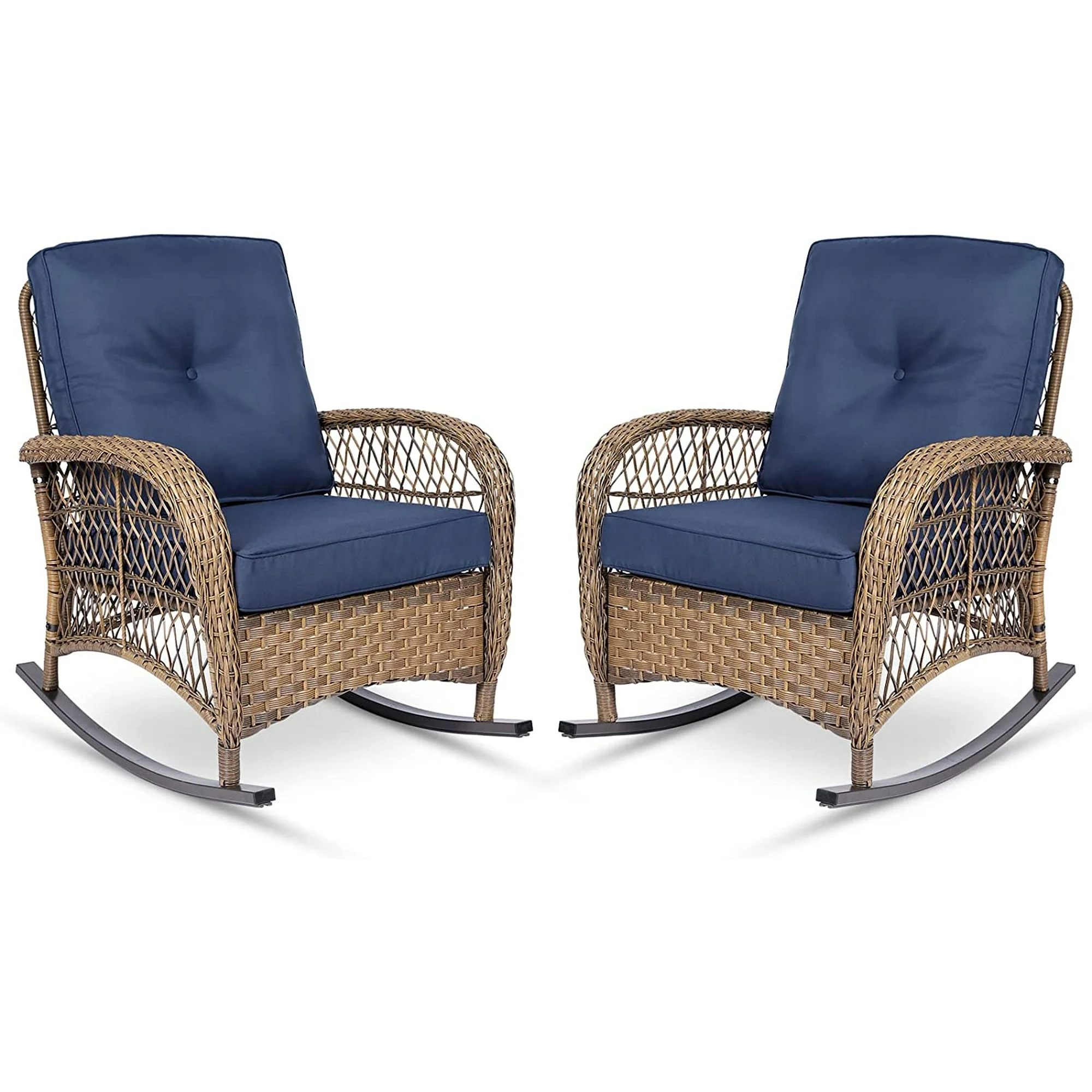 MEETWARM Outdoor Wicker Patio Rocking Chair Cushioned Rattan Rocker Chair for Porch, Deck, Poolside with Steel Frame, Weather-Resistant Navy Blue Cushions, Set of 2