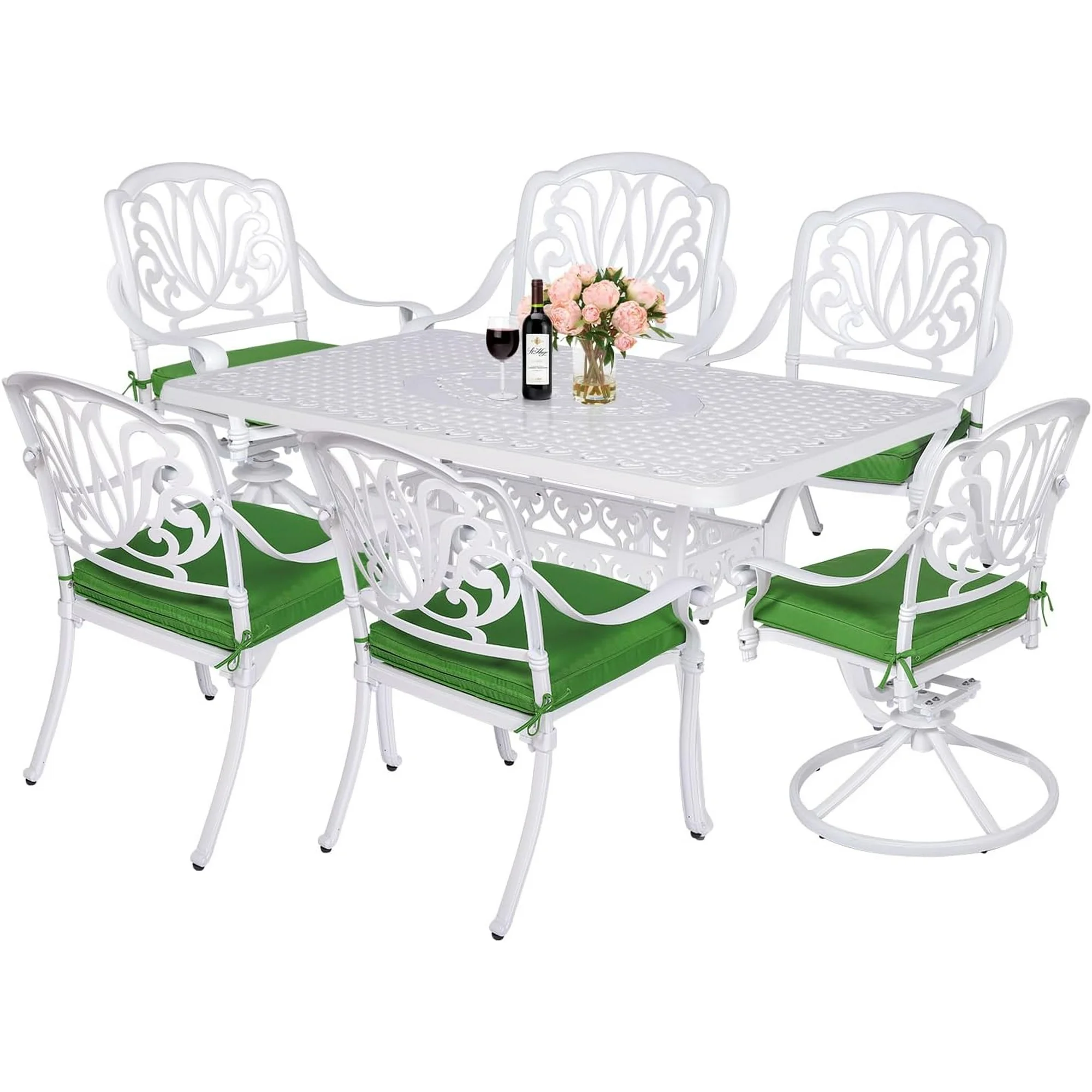 MEETWARM 7-Piece Outdoor Patio Dining Set, All-Weather Cast Aluminum Patio Conversation Set for Backyard Garden Deck with 6 Cushioned Swivel Rocker Chairs, 1 Rectangular Table, 2" Umbrella Hole