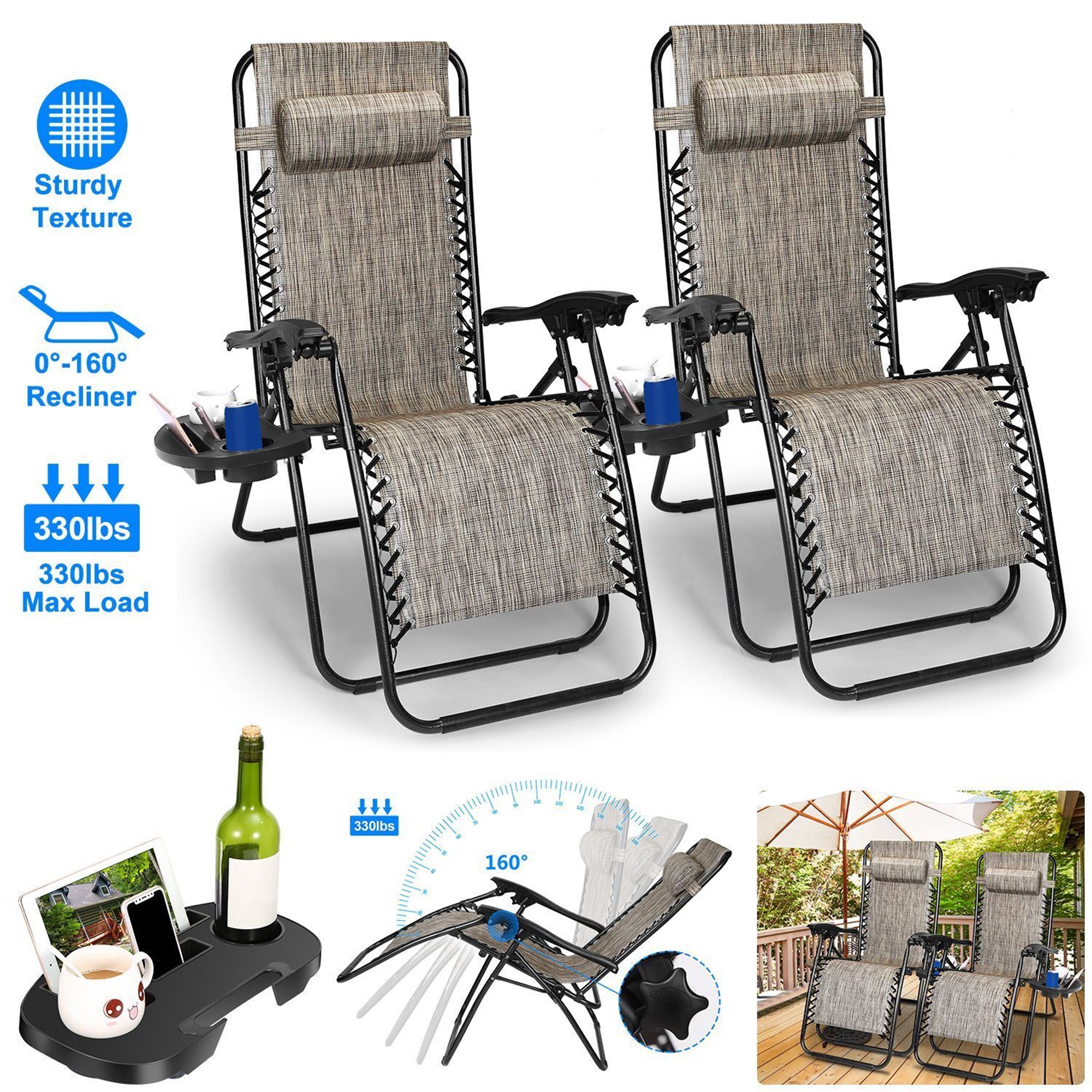 iMounTEK Set of 2 Adjustable Steel Mesh Zero Gravity Lounge Chair Recliners with Pillows