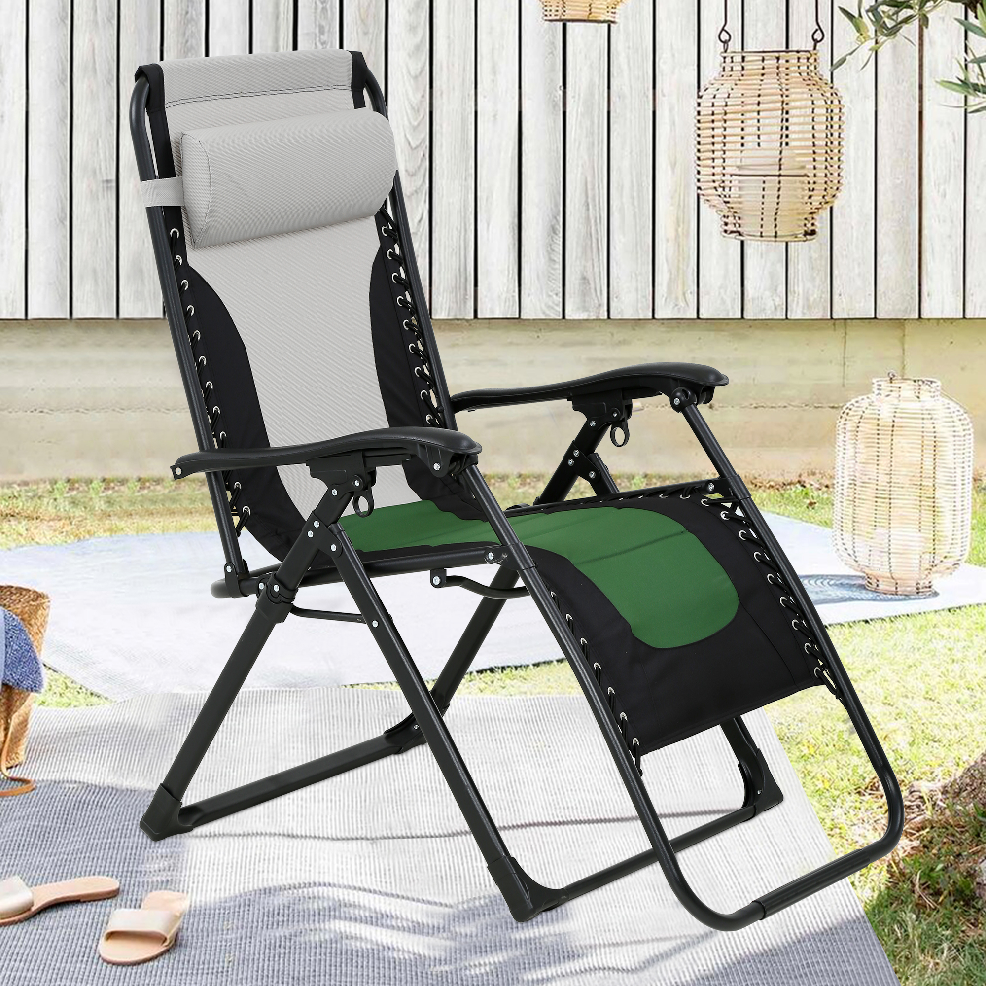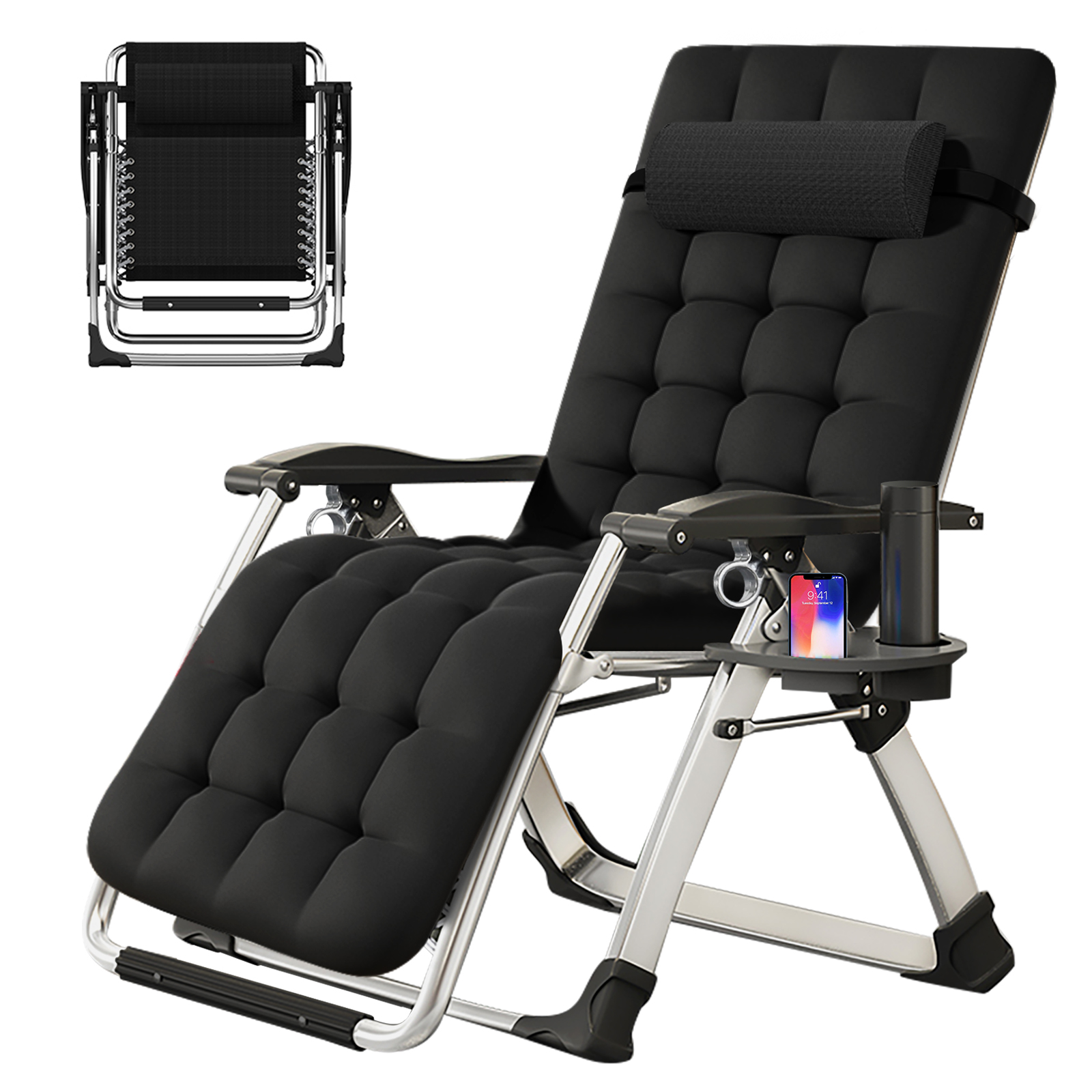 Black Patio Lounge Chairs Oversized Zero Gravity Chair, Foldable Lawn Reclining Patio Lounger Chair with Detachable Soft Cushion, Adjustable Headrest