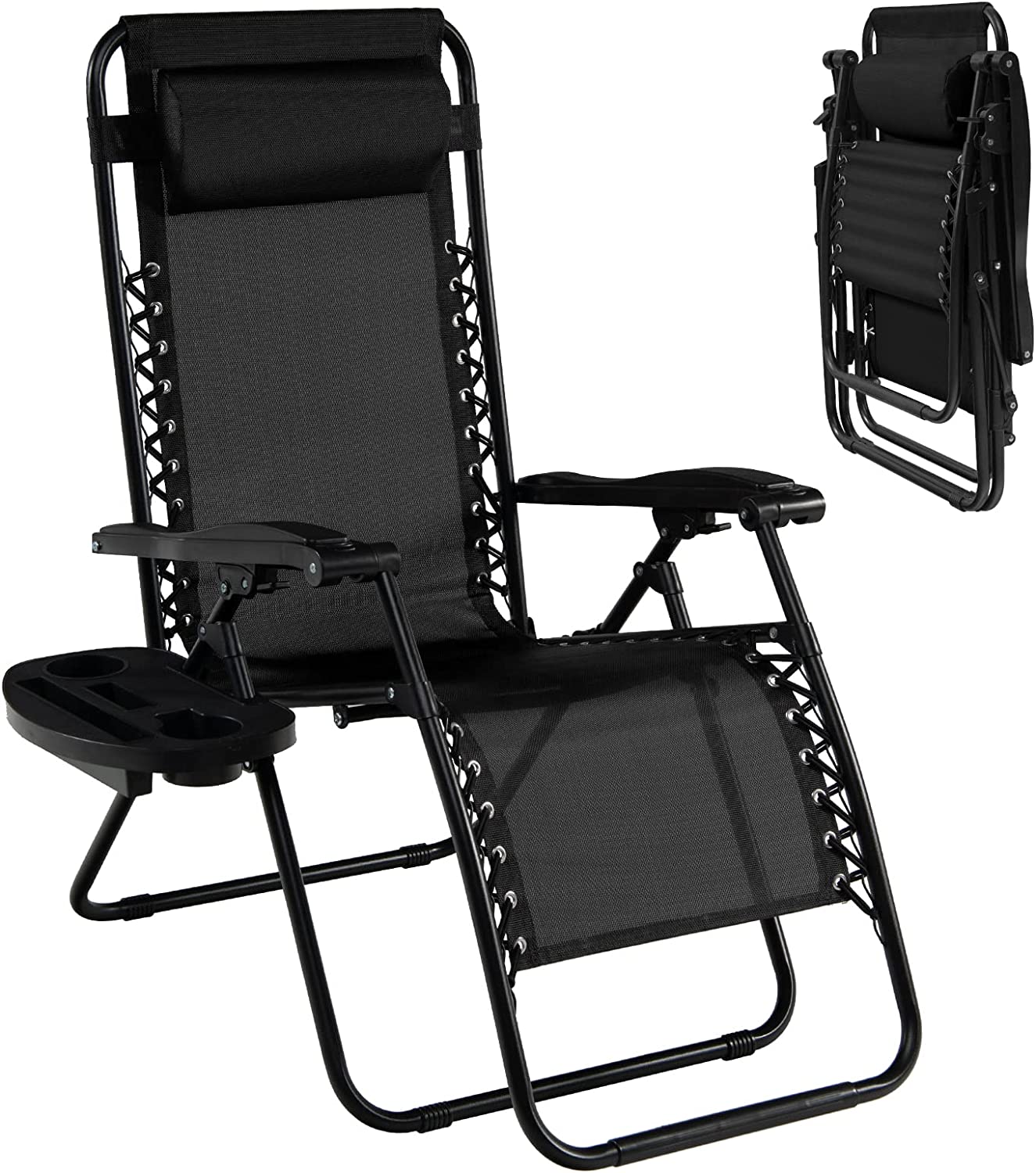 Zero Gravity Chair, Adjustable Folding Reclining Lounge Chair with Pillow and Cup Holder, Patio Lawn Recliner for Outdoor Pool Camp Yard, Black