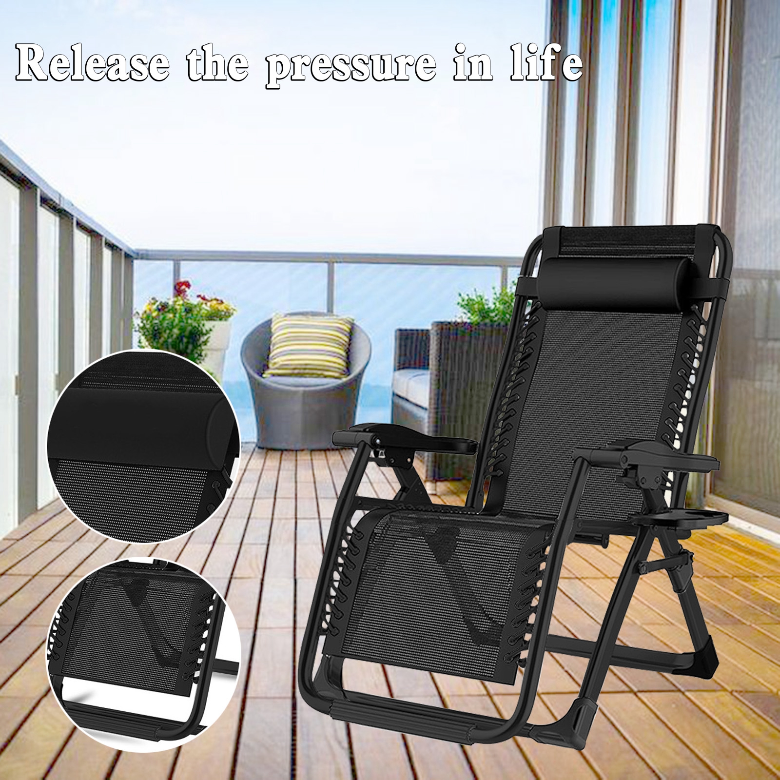 Zero Gravity Chairs, X-Large Outdoor Lounge Lawn Chair with Cup Holder & Detachable Headrest, Adjustable Folding Patio Recliner for Pool Porch Deck Oversize (Black)