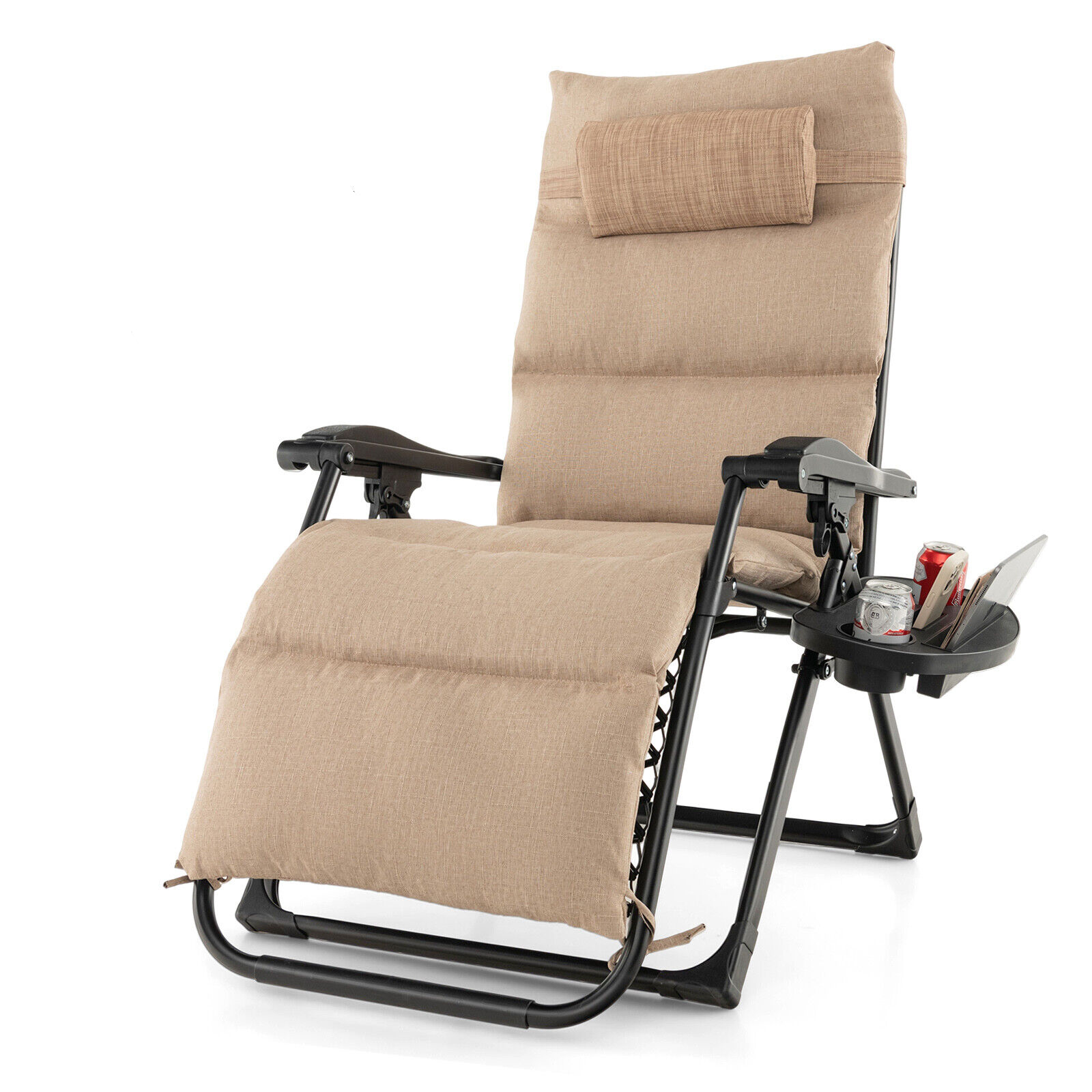Exdeerjoy Adjustable Metal Zero Gravity Lounge Chair with Removable Cushion and Cup Holder Tray, Folding Reclining Chair with Headrest Beige